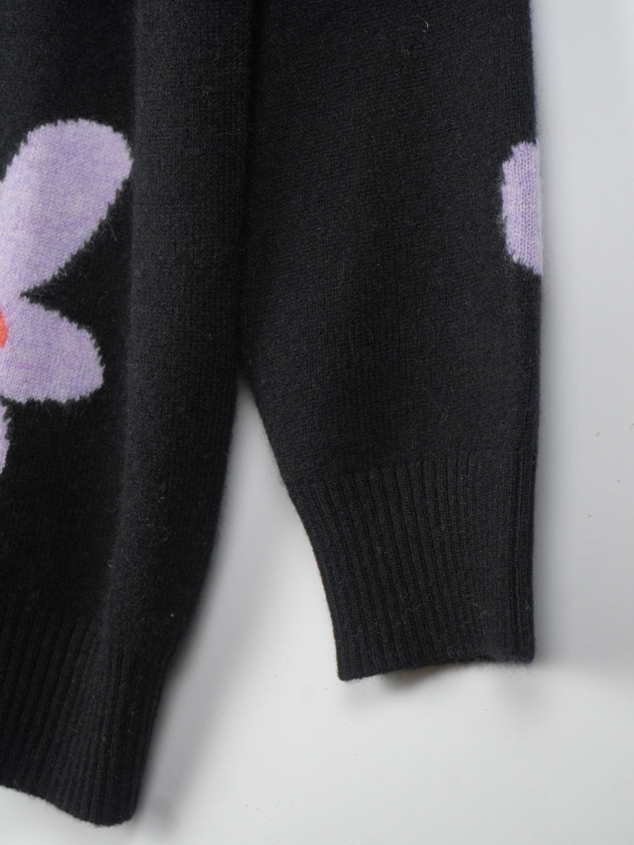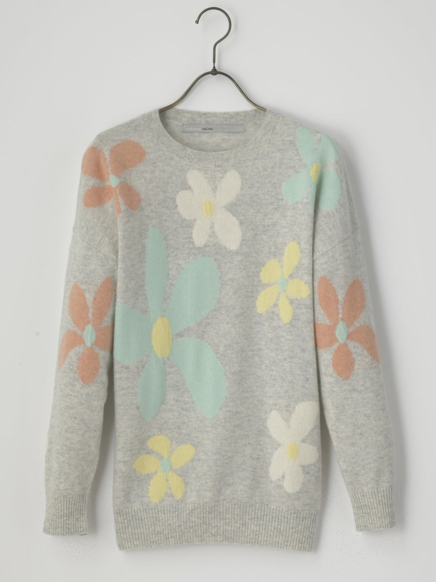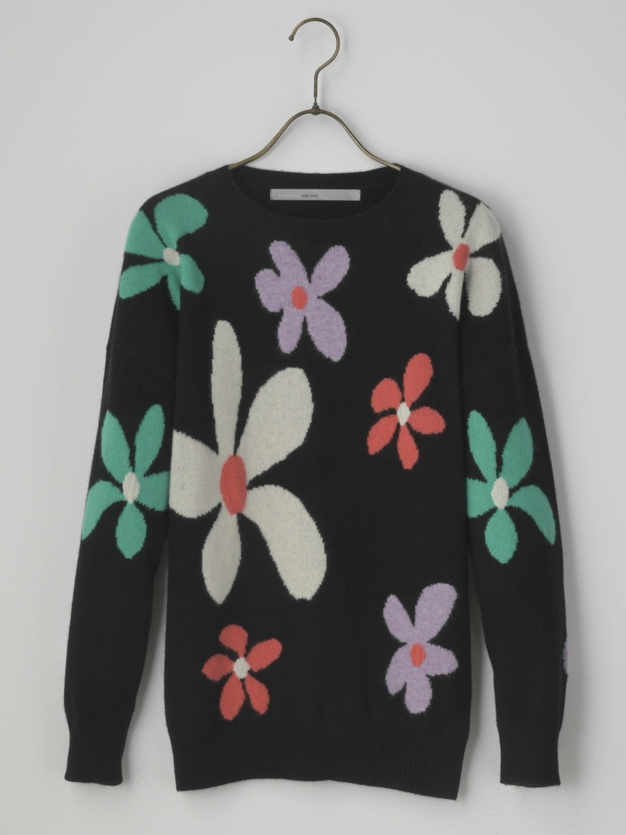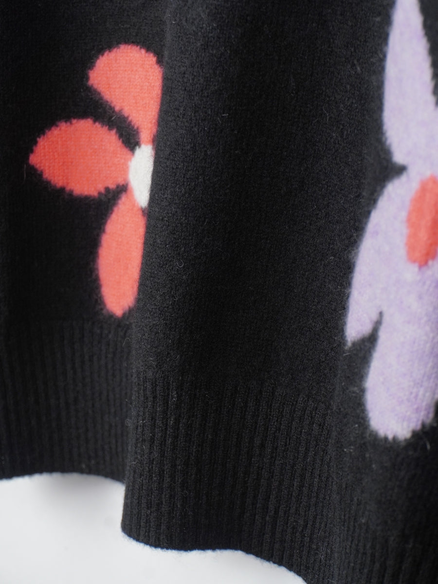 ザックリとした着丈に大胆な花柄を散りばめたクルーネックセーター。ブラックベースに散りばめた花はインパクトある印象でライトグレーの花は優しい女性らしい印象です。この秋冬を元気にしてくれるアイテムです。