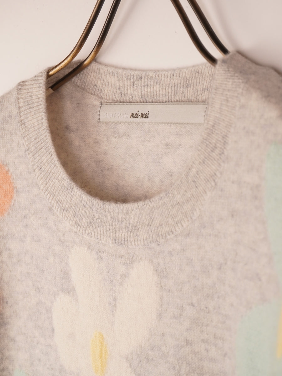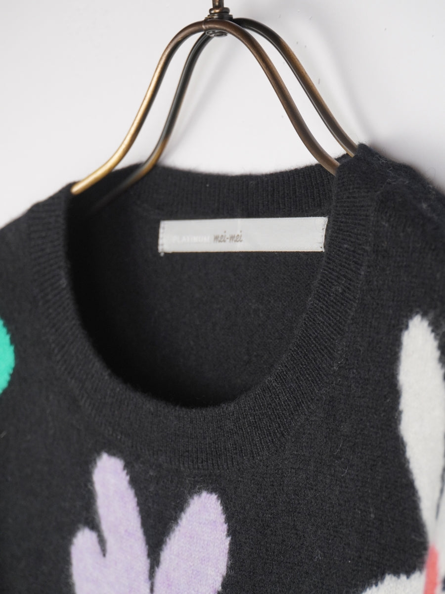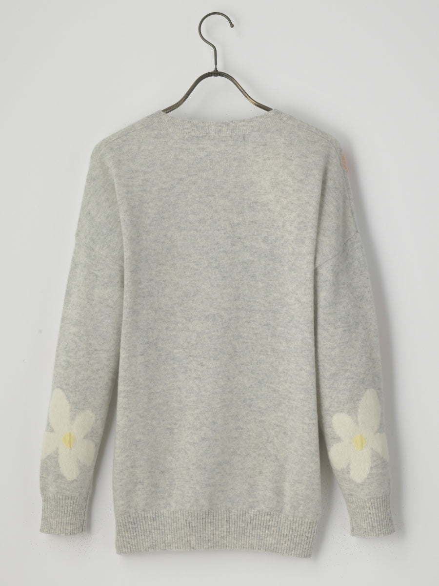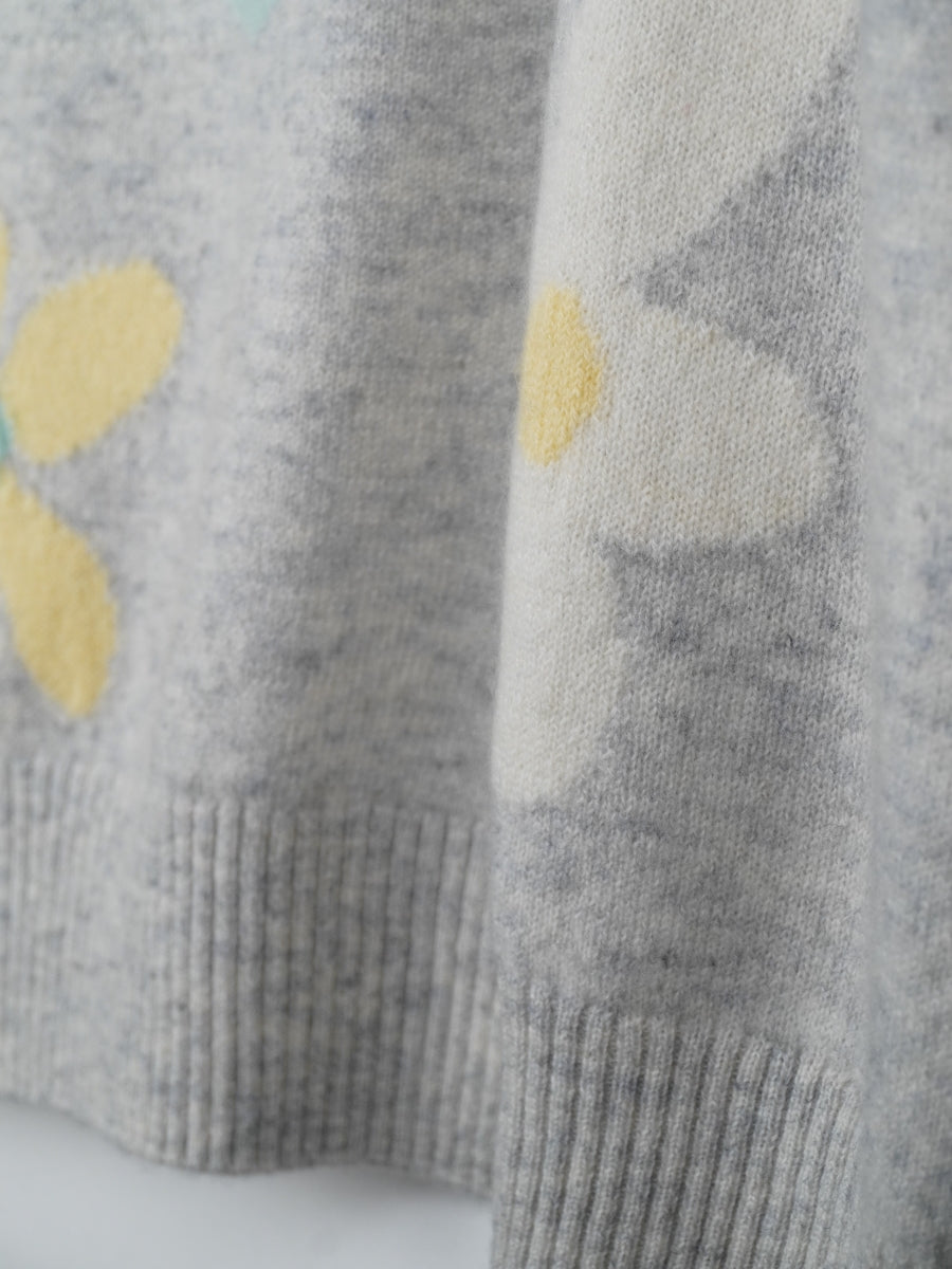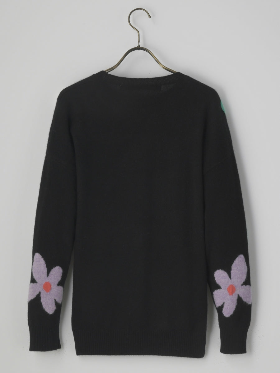 ザックリとした着丈に大胆な花柄を散りばめたクルーネックセーター。ブラックベースに散りばめた花はインパクトある印象でライトグレーの花は優しい女性らしい印象です。この秋冬を元気にしてくれるアイテムです。
