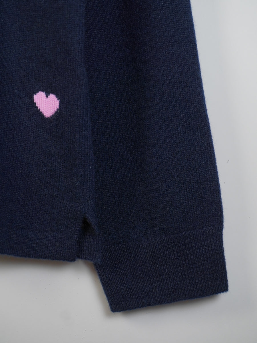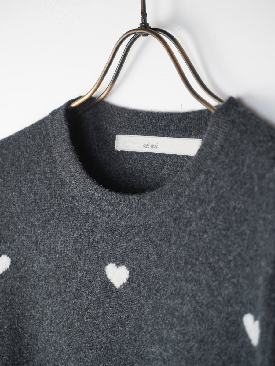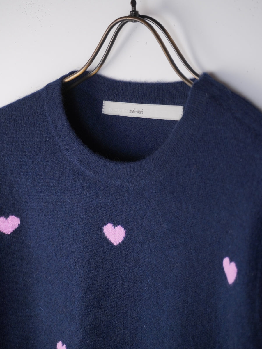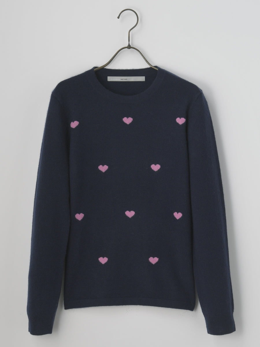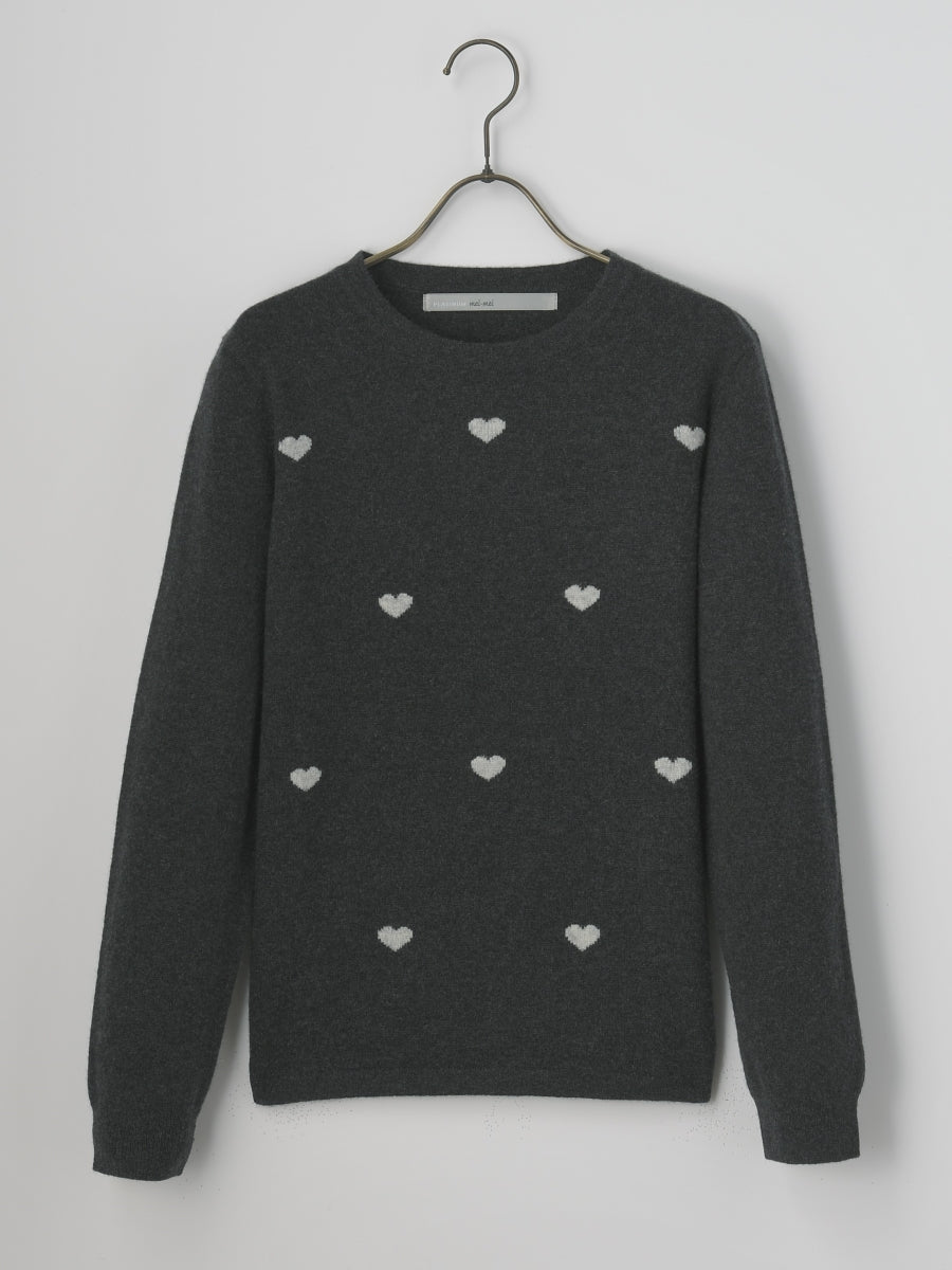 前にごろにキュートなハート柄が可愛いカシミヤ100%のクルーネックプルオーバー。ベーシックなアイテムも小さなハート柄で大変身。