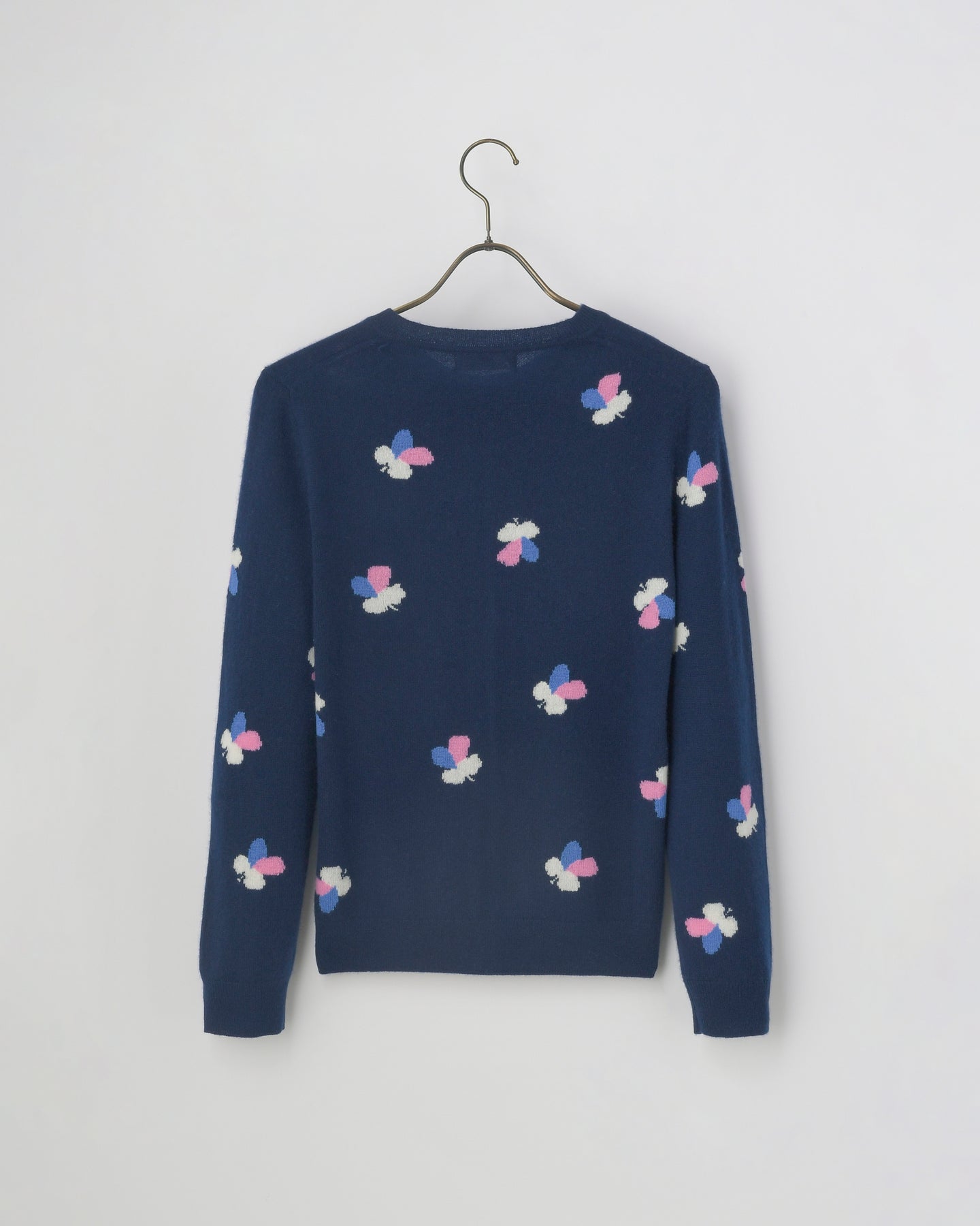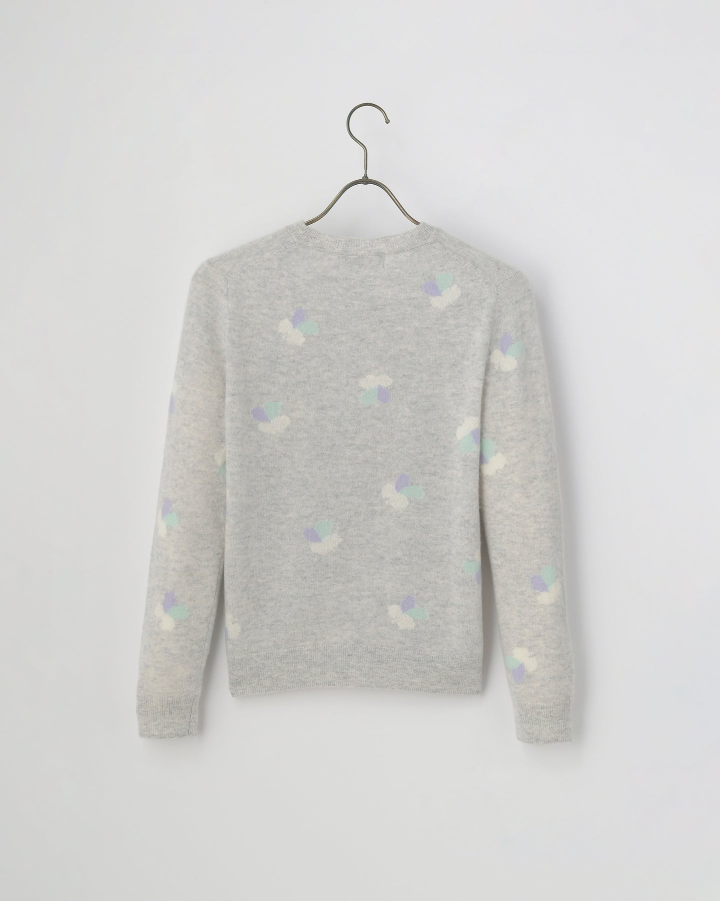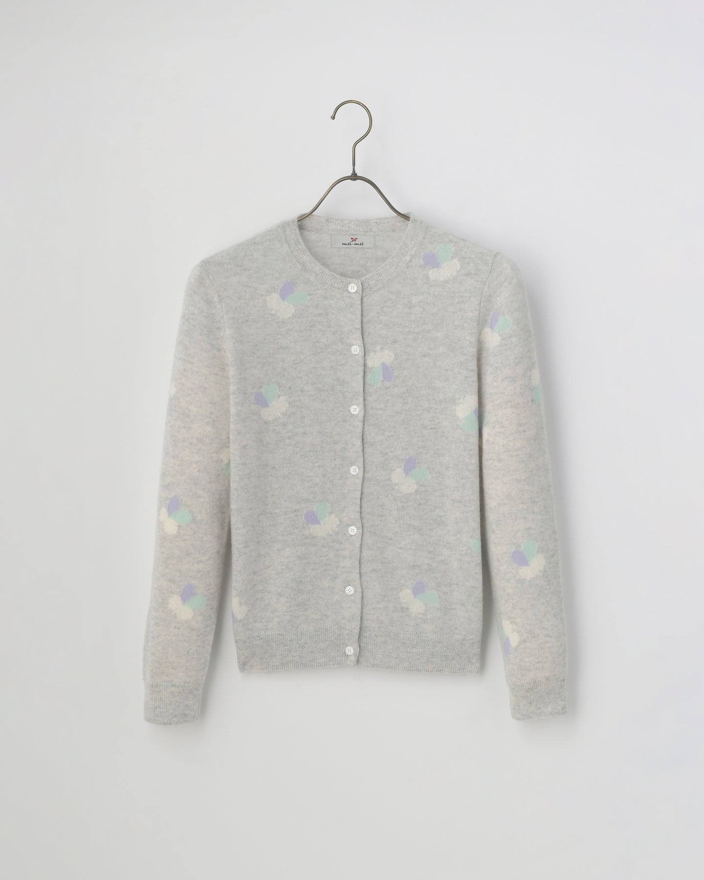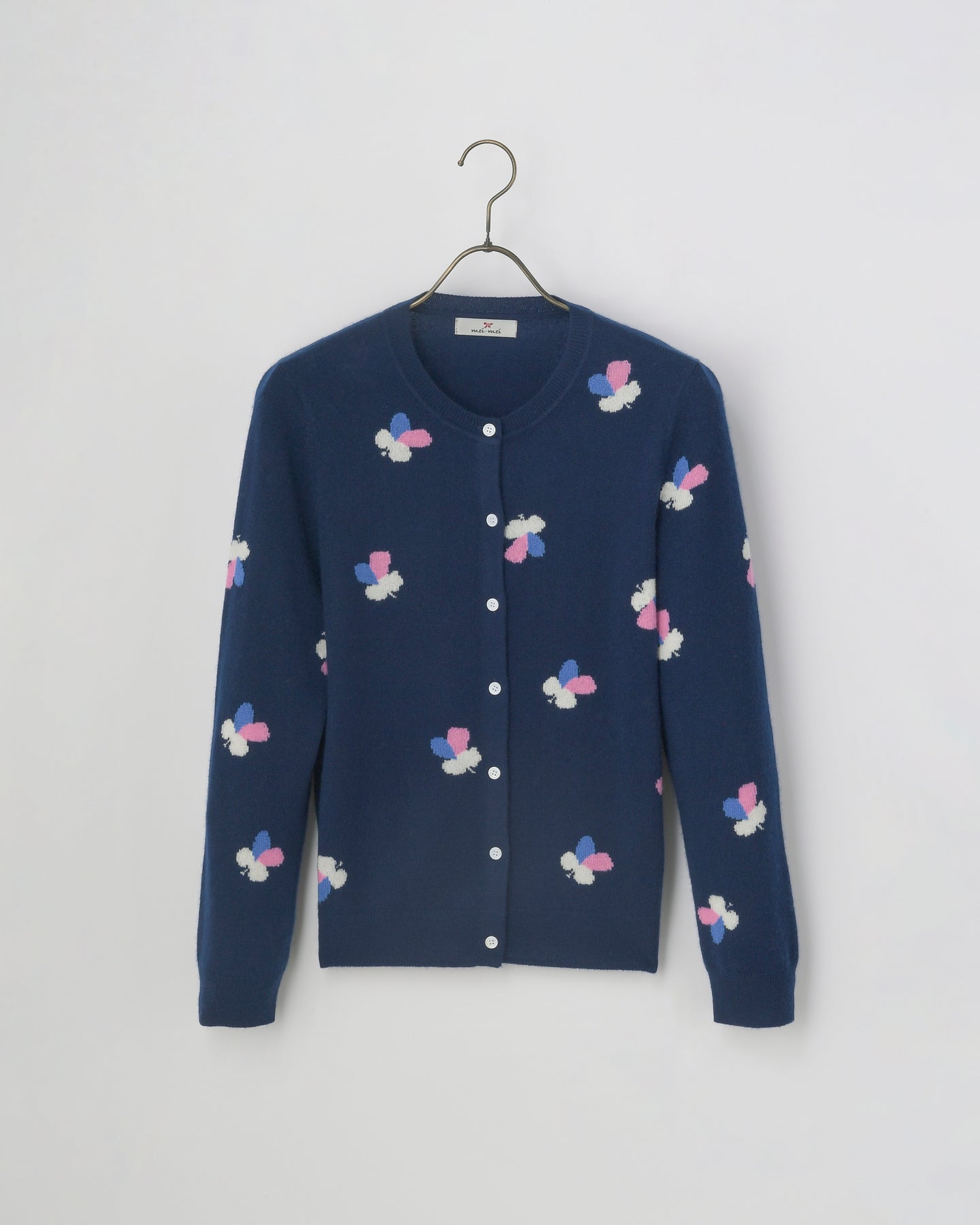 花びらを広げたような柄感がキュートなシンプルカーディガン。カシミヤ素材と柄の持つソフトさが演出されて、着ていると少し春さえ感じるでしょう。