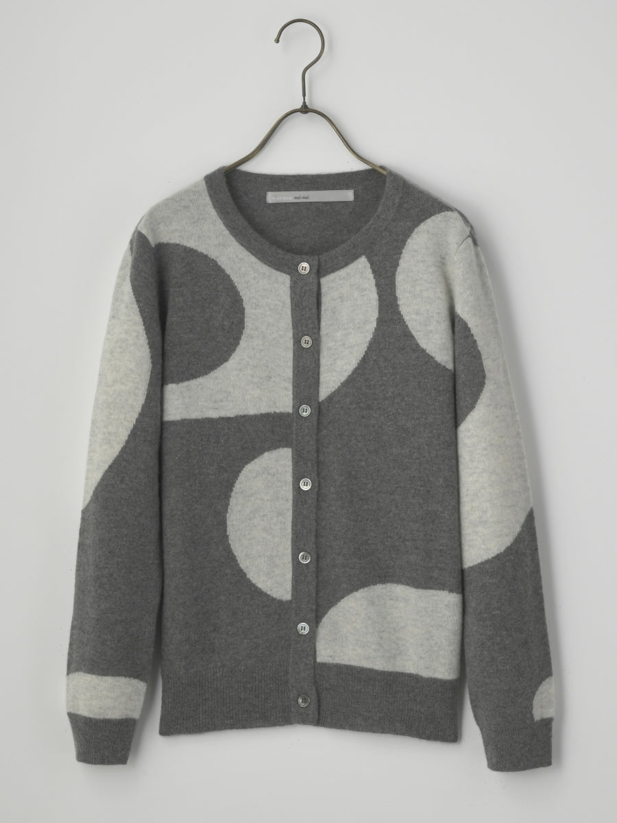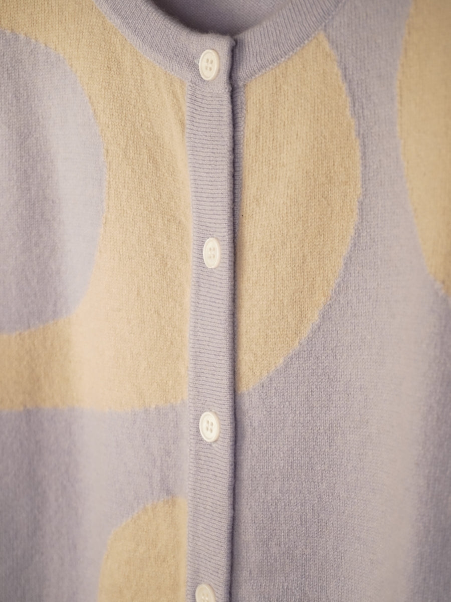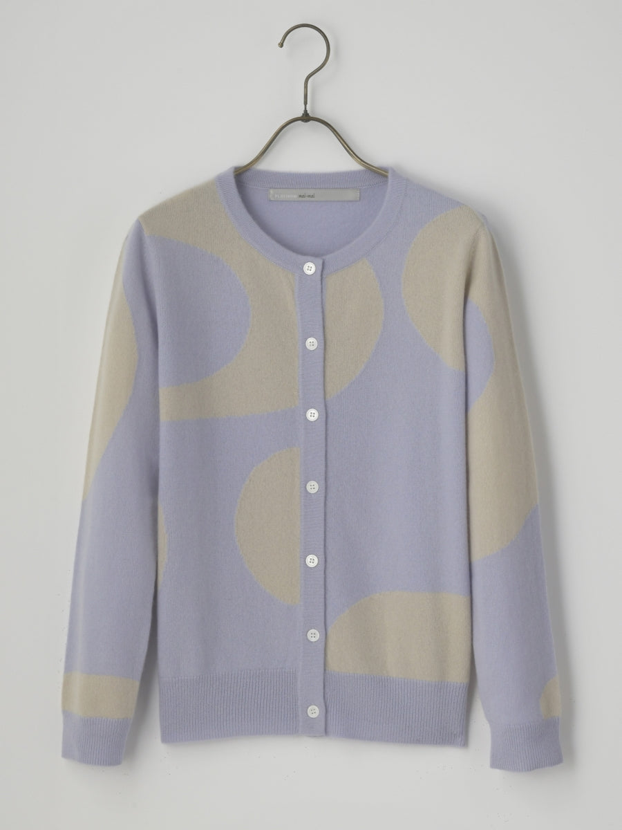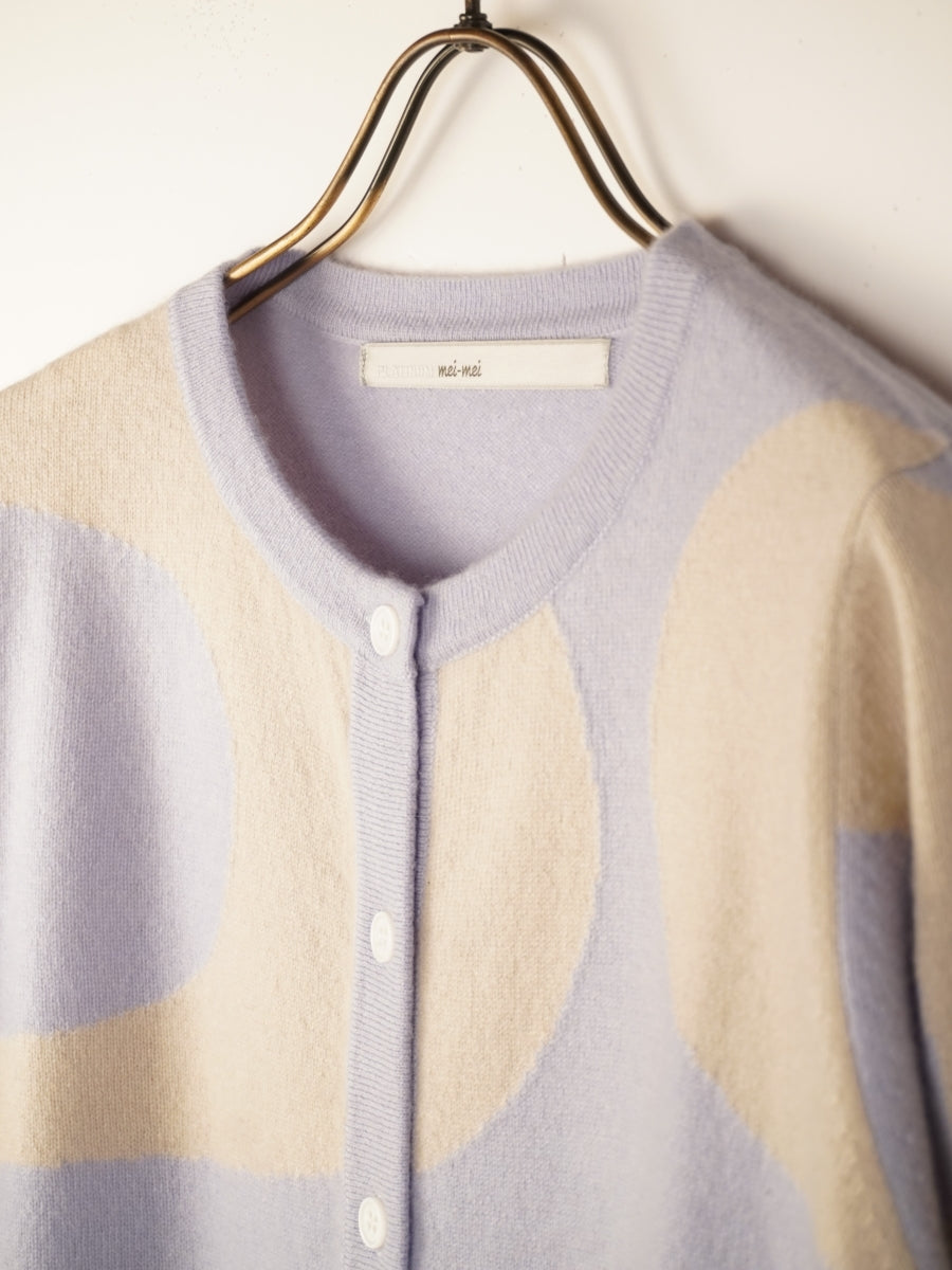 今年のフォーリングシリーズは、優しい配色でまとめてみました。カーディガン全体をを大き目なサークルが交わったような配色デザインが一番のポイント。