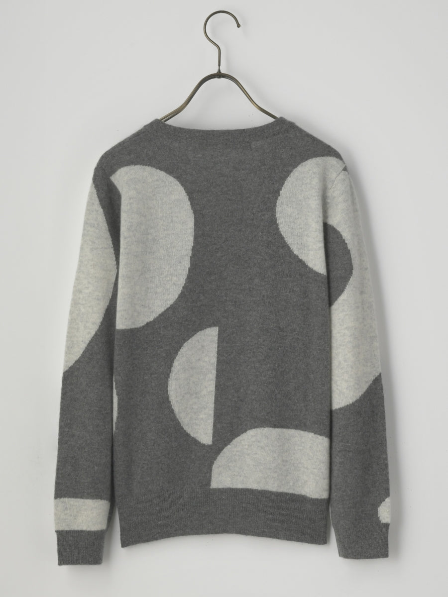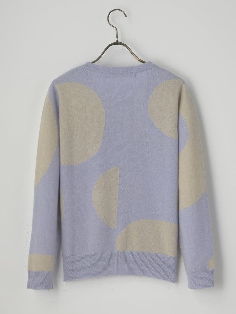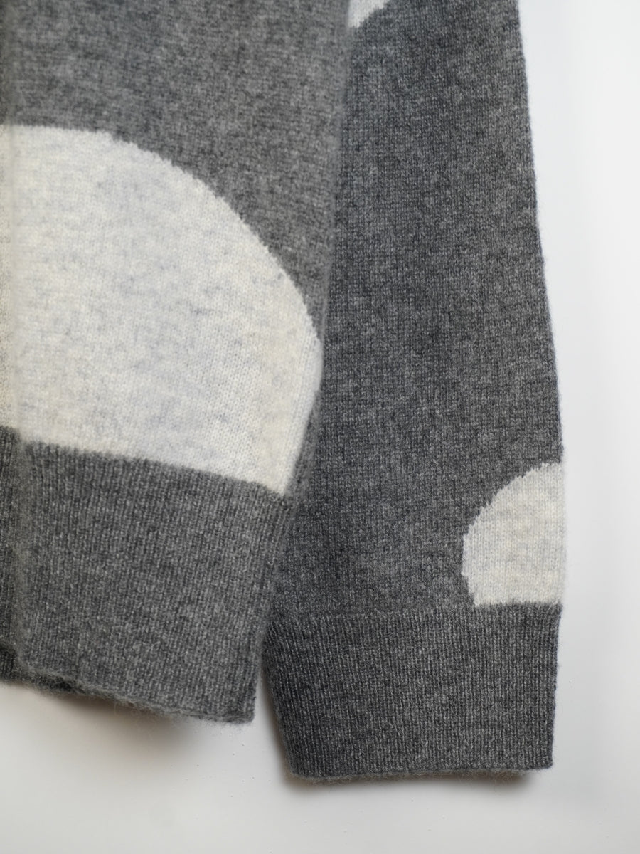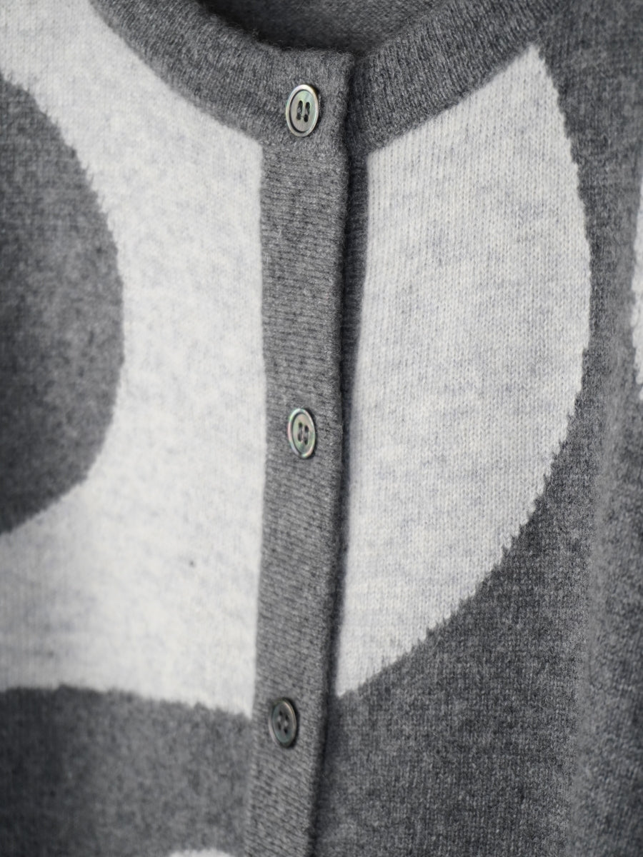 今年のフォーリングシリーズは、優しい配色でまとめてみました。カーディガン全体をを大き目なサークルが交わったような配色デザインが一番のポイント。