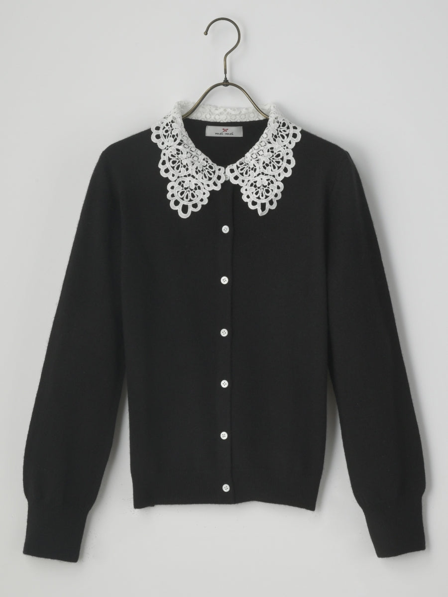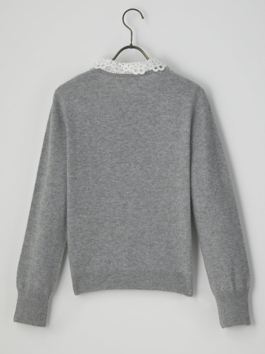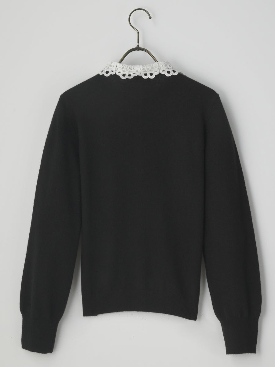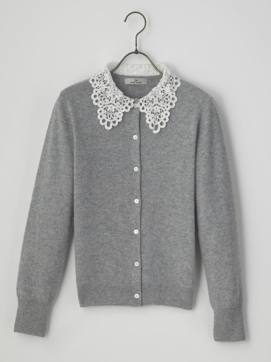 上質なカシミヤ素材と肌触りの良いケミカルレースが組み合わさった貴賓あるカーディガンです。レースの上品さが全体をより一層華やかにしてくれます。