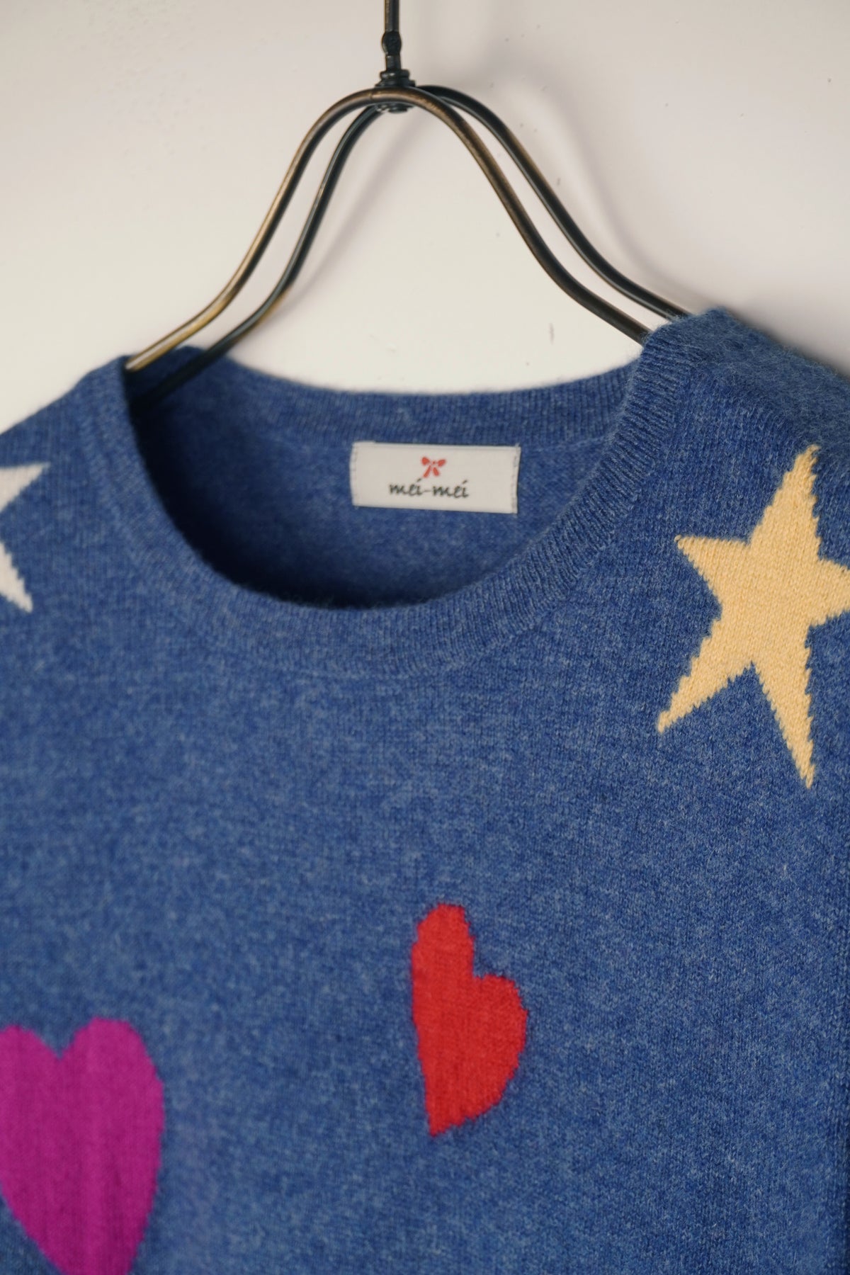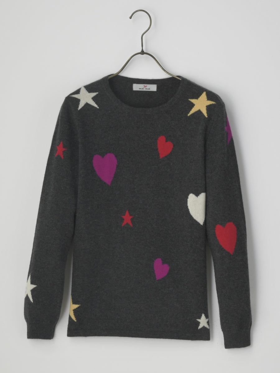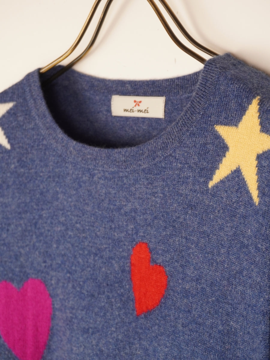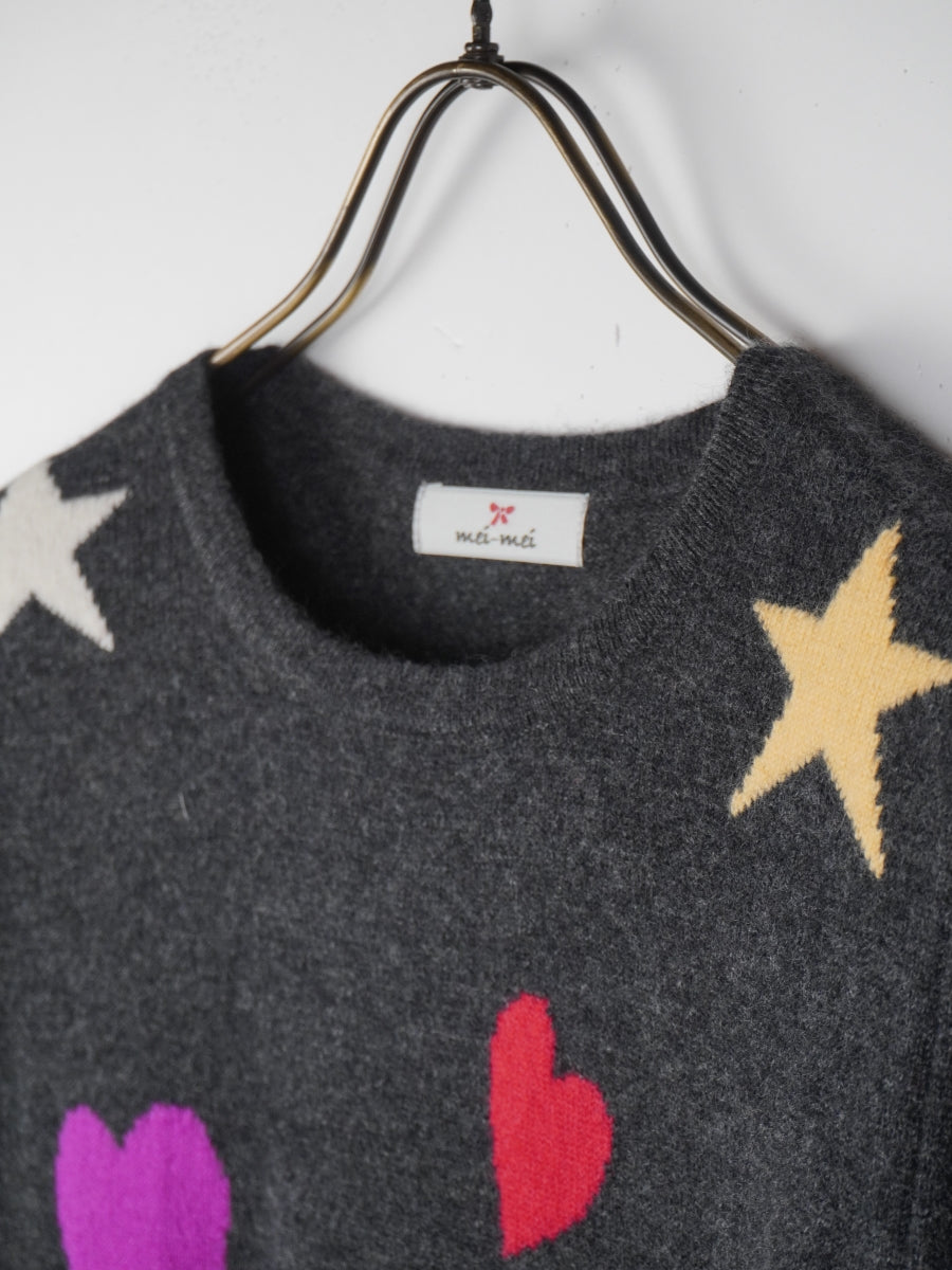 コミカルなハートモチーフと星柄が前身ごろと袖を彩る。一つのモチーフでは、物足りなくなったあなたの為にお届けします。ハート柄と星柄のカラー配色も必見です。