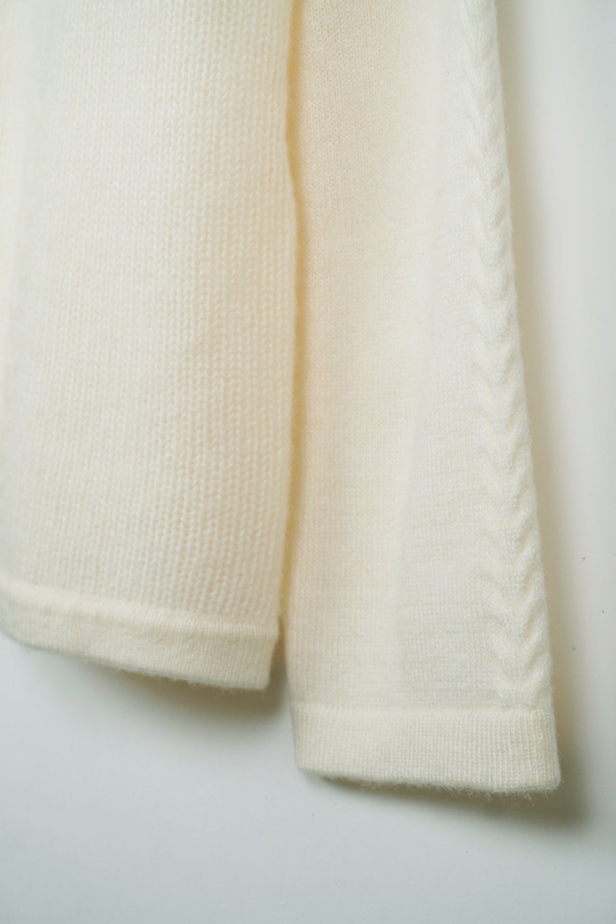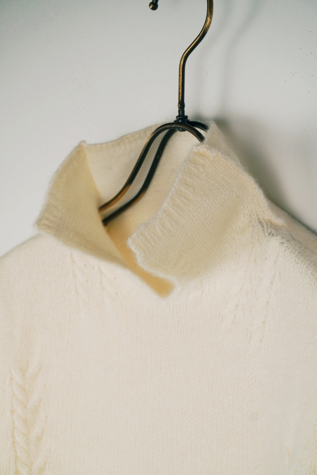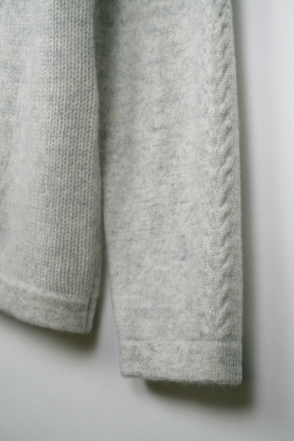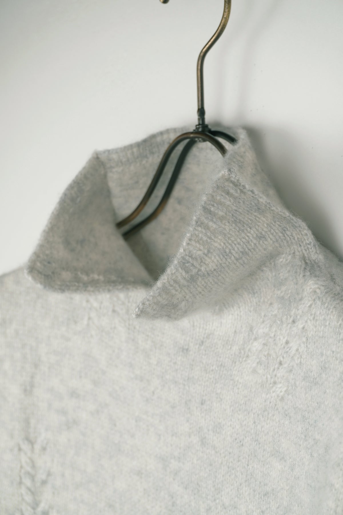 カシミヤの暖かみと編地の変化と襟元のデザインを楽しく味わえるプルオーバーセーターです。ふんわりとした編地にプラスして部分編みで使用するケーブル編みのバランスが最高です。