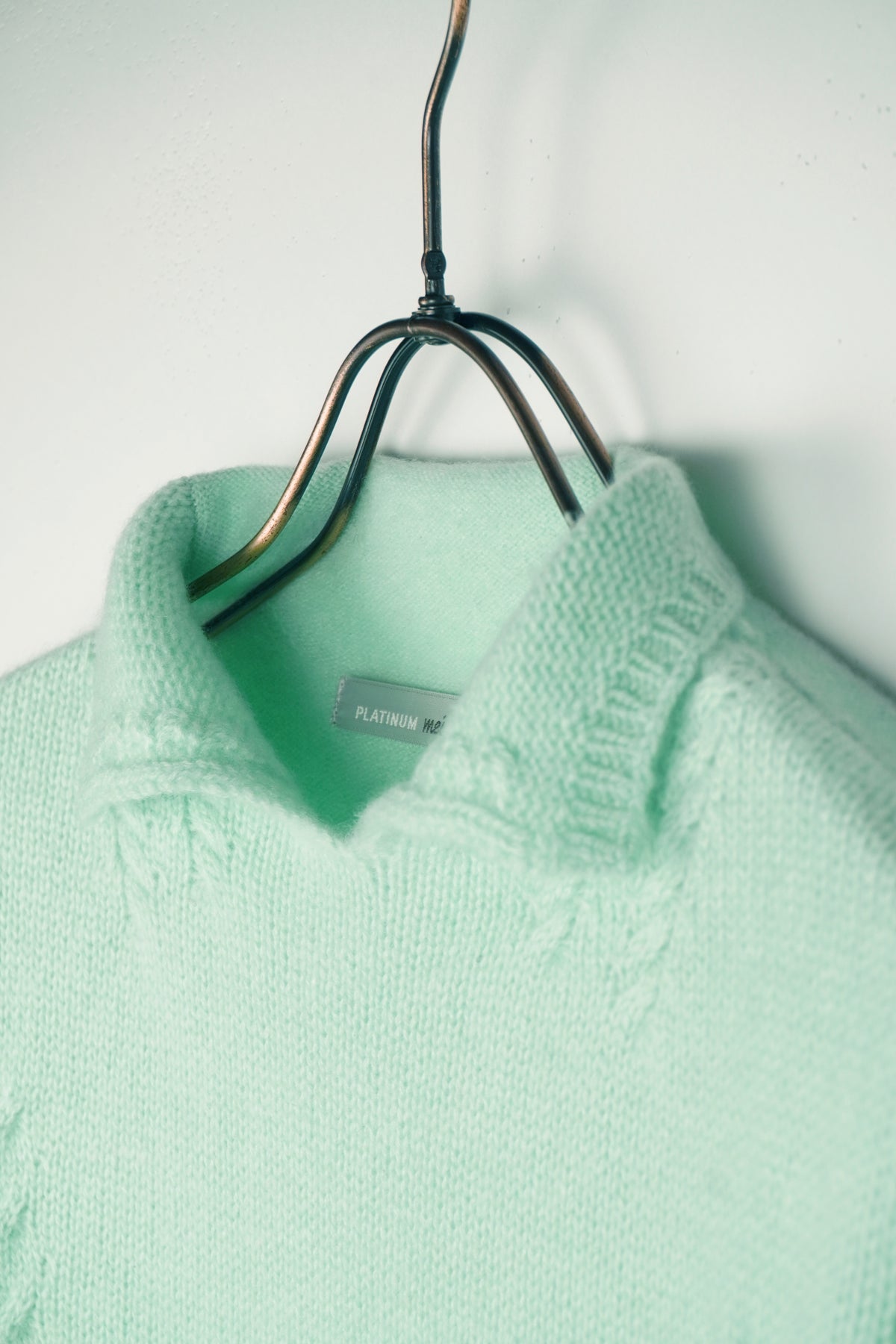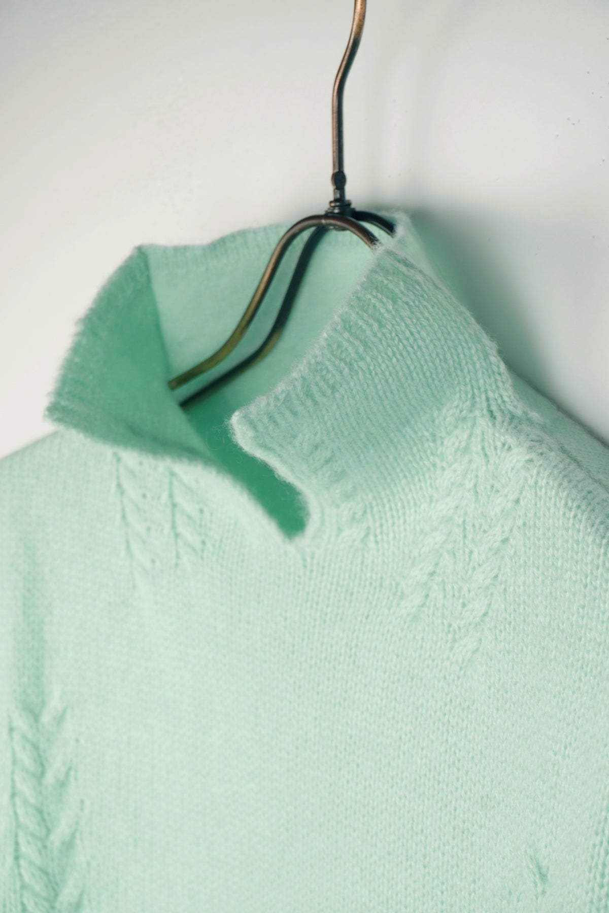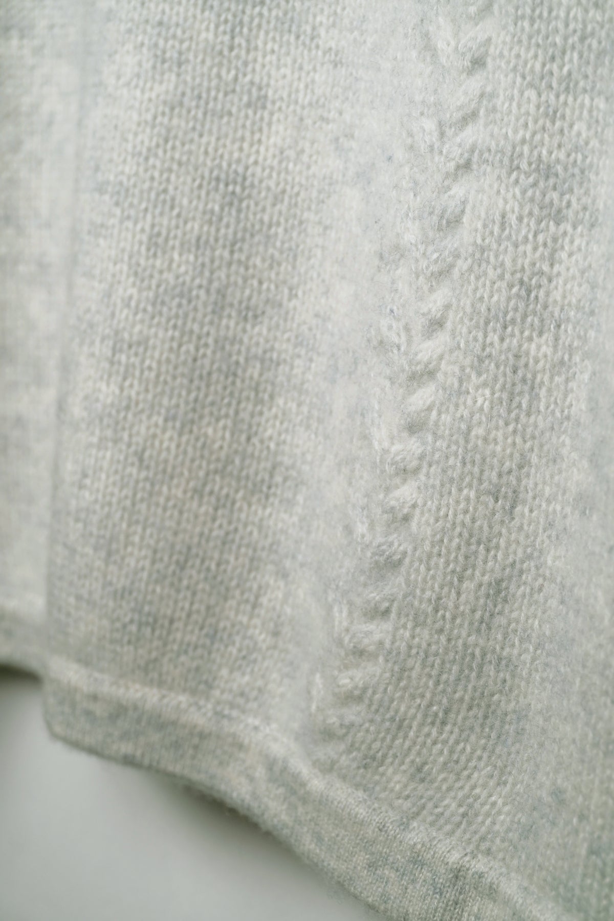 カシミヤの暖かみと編地の変化と襟元のデザインを楽しく味わえるプルオーバーセーターです。ふんわりとした編地にプラスして部分編みで使用するケーブル編みのバランスが最高です。