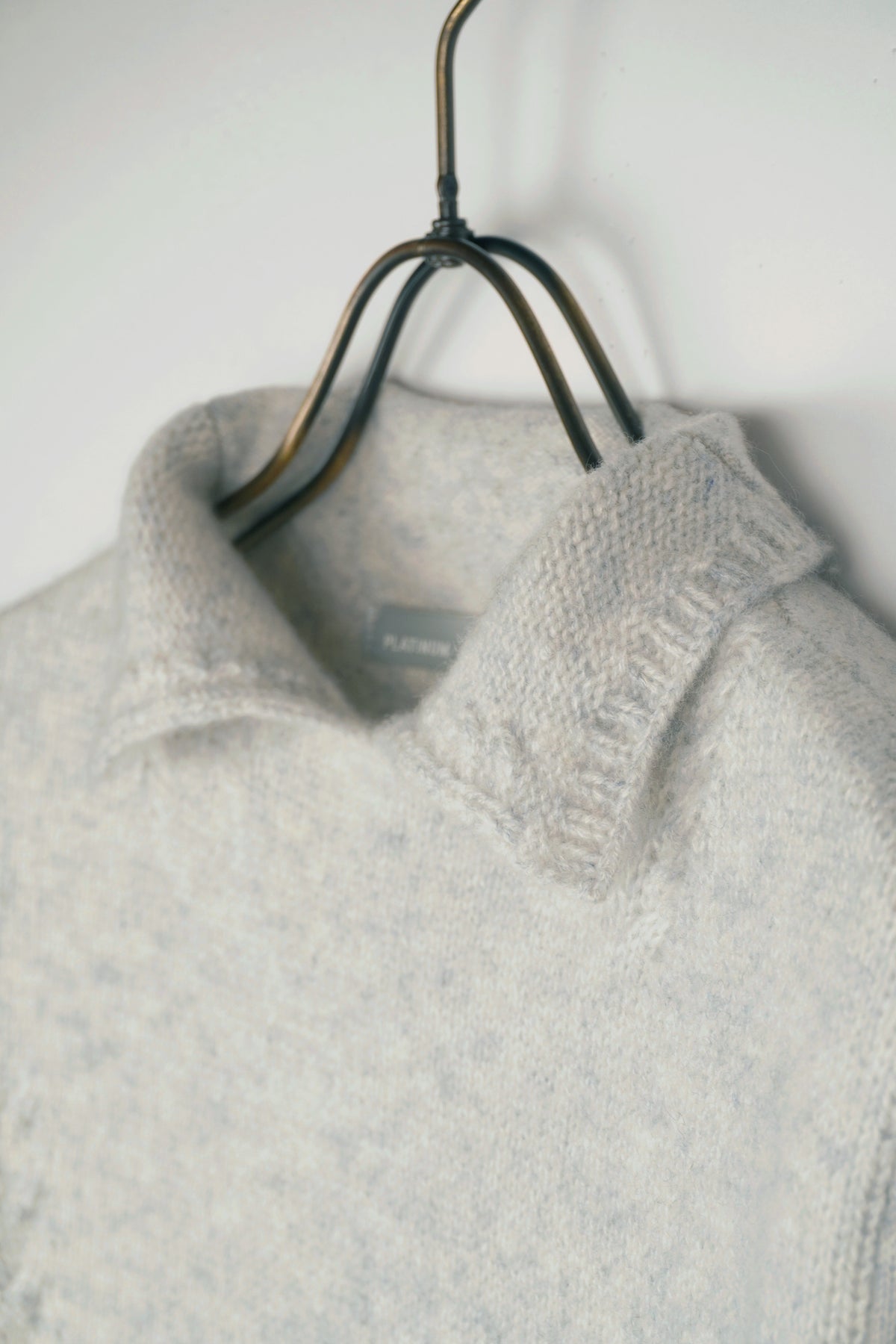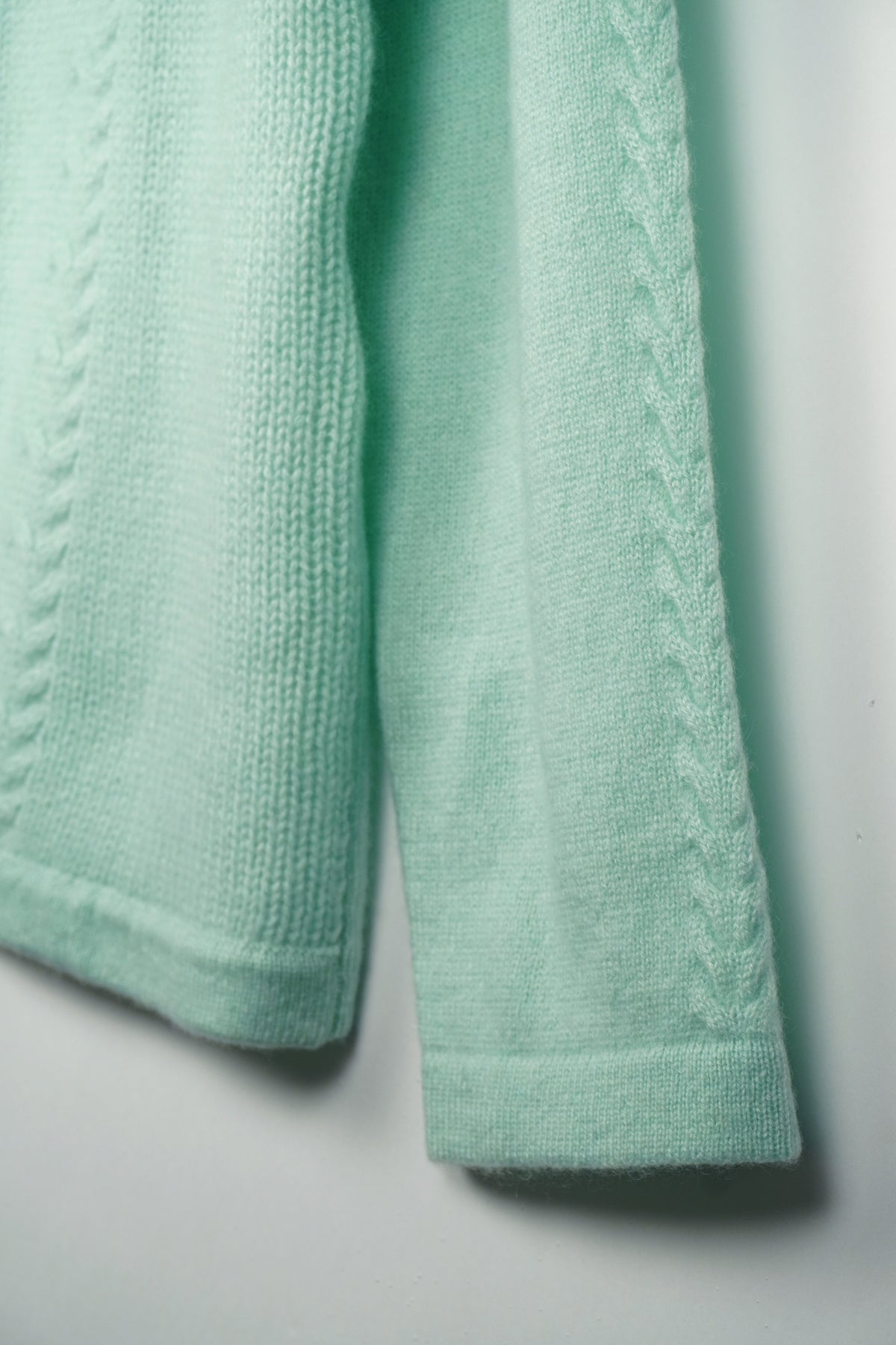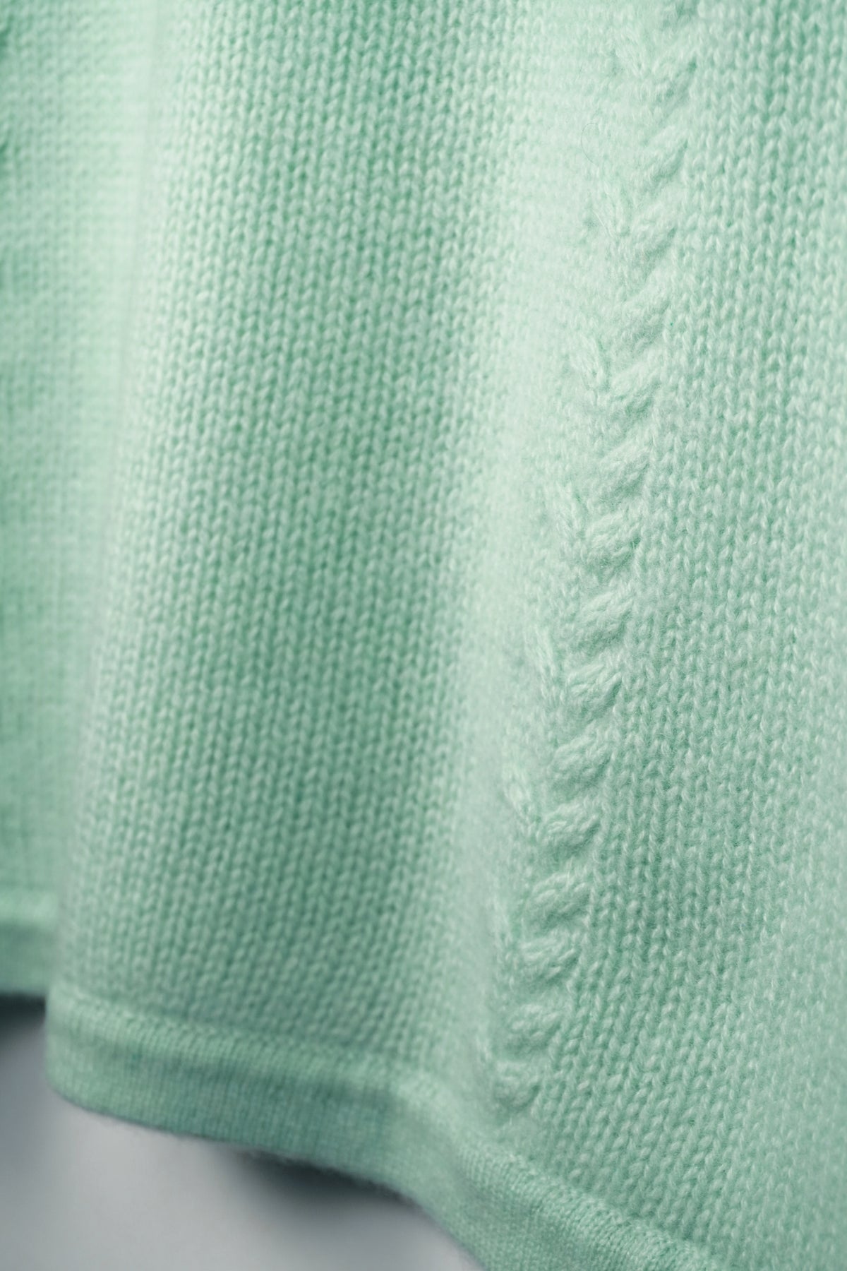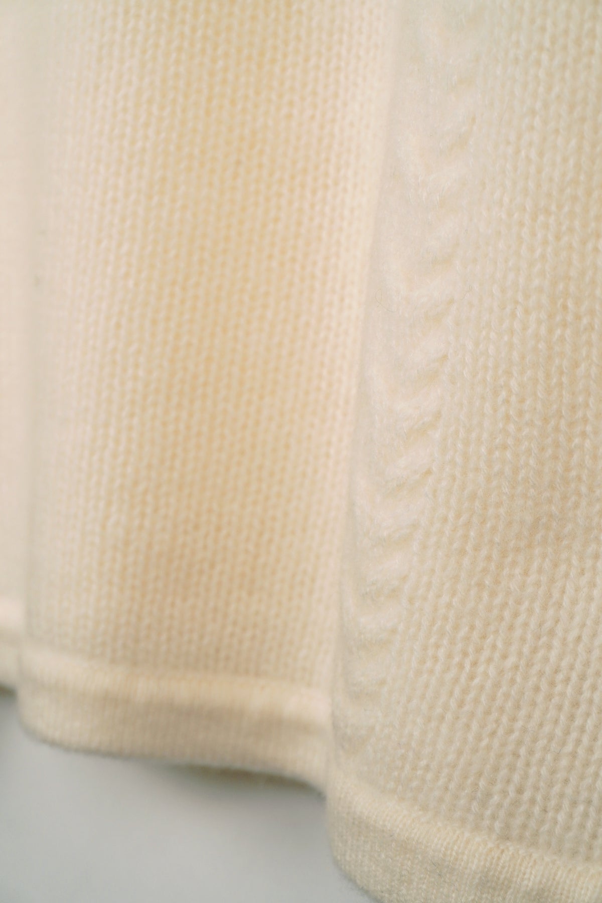 カシミヤの暖かみと編地の変化と襟元のデザインを楽しく味わえるプルオーバーセーターです。ふんわりとした編地にプラスして部分編みで使用するケーブル編みのバランスが最高です。