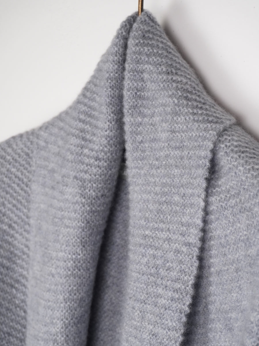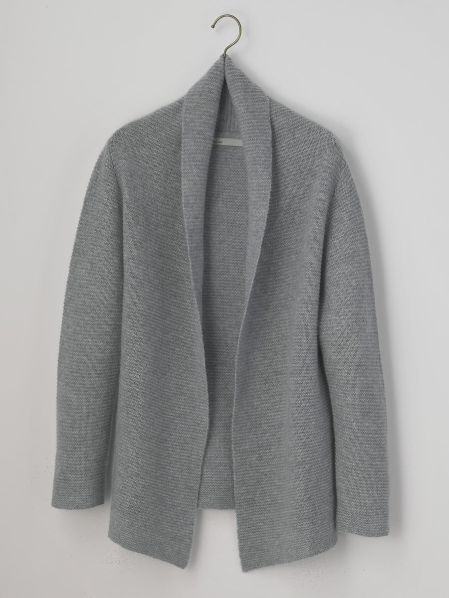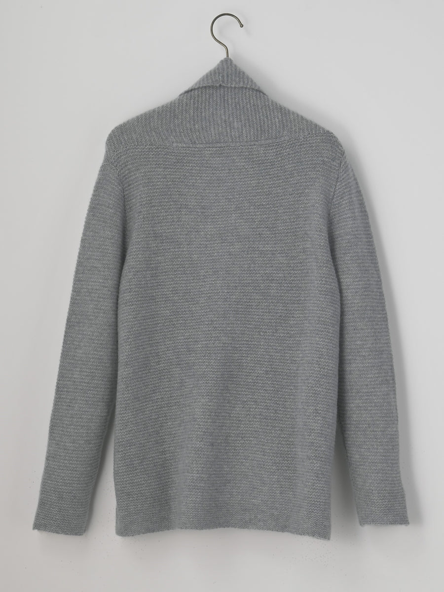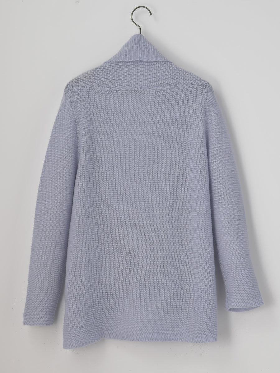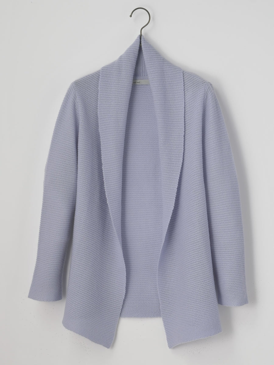 注目のガーター編みカーディガンが今年も色目を変えて登場です。小さなショールカラーが特徴で、首元をスッキリ見せるデザインです。