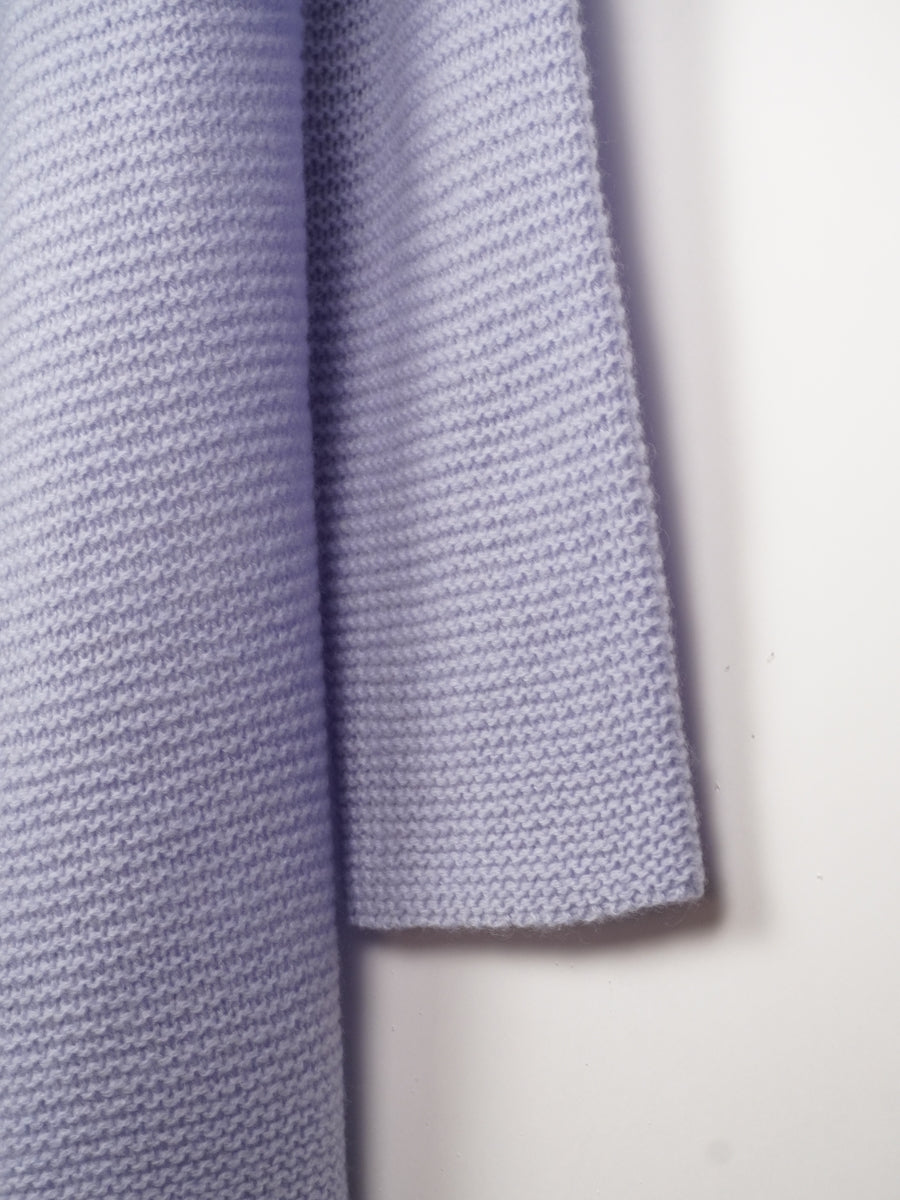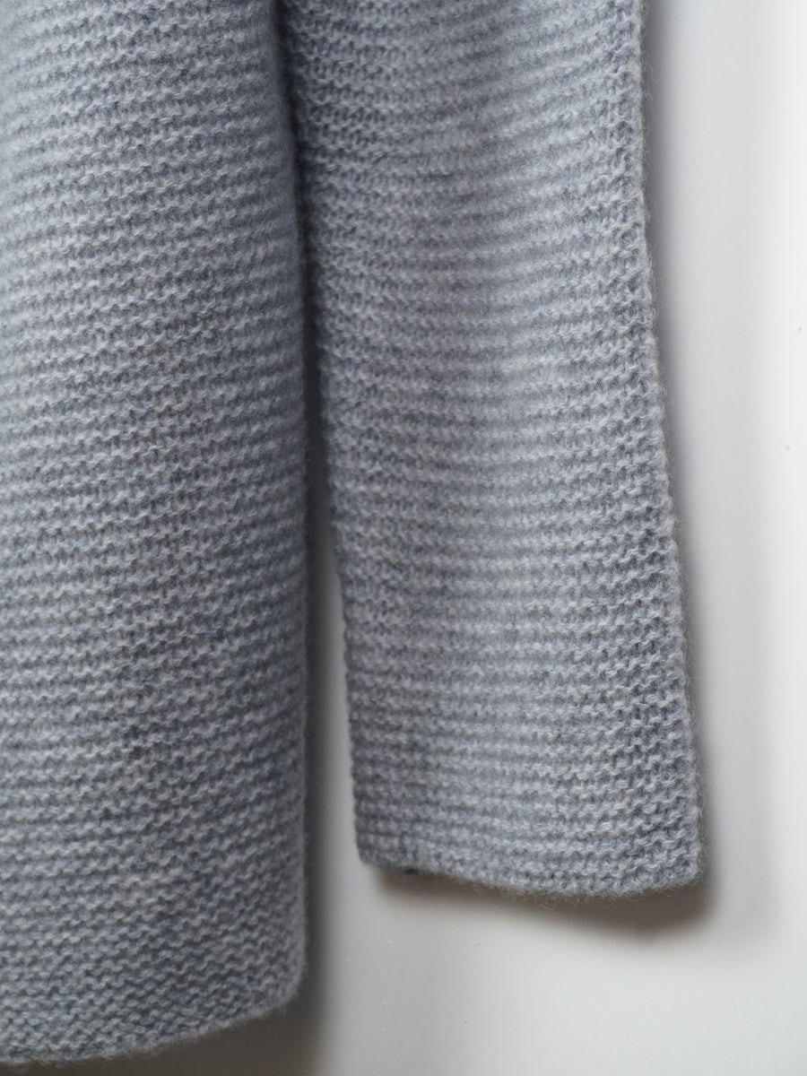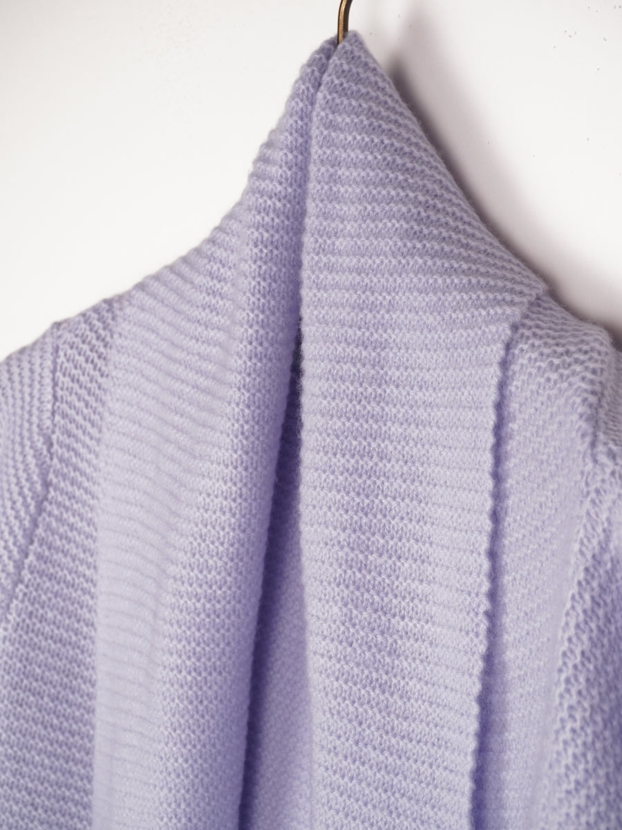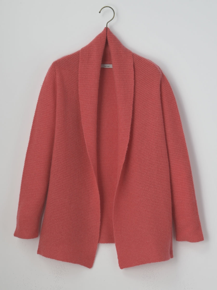注目のガーター編みカーディガンが今年も色目を変えて登場です。小さなショールカラーが特徴で、首元をスッキリ見せるデザインです。