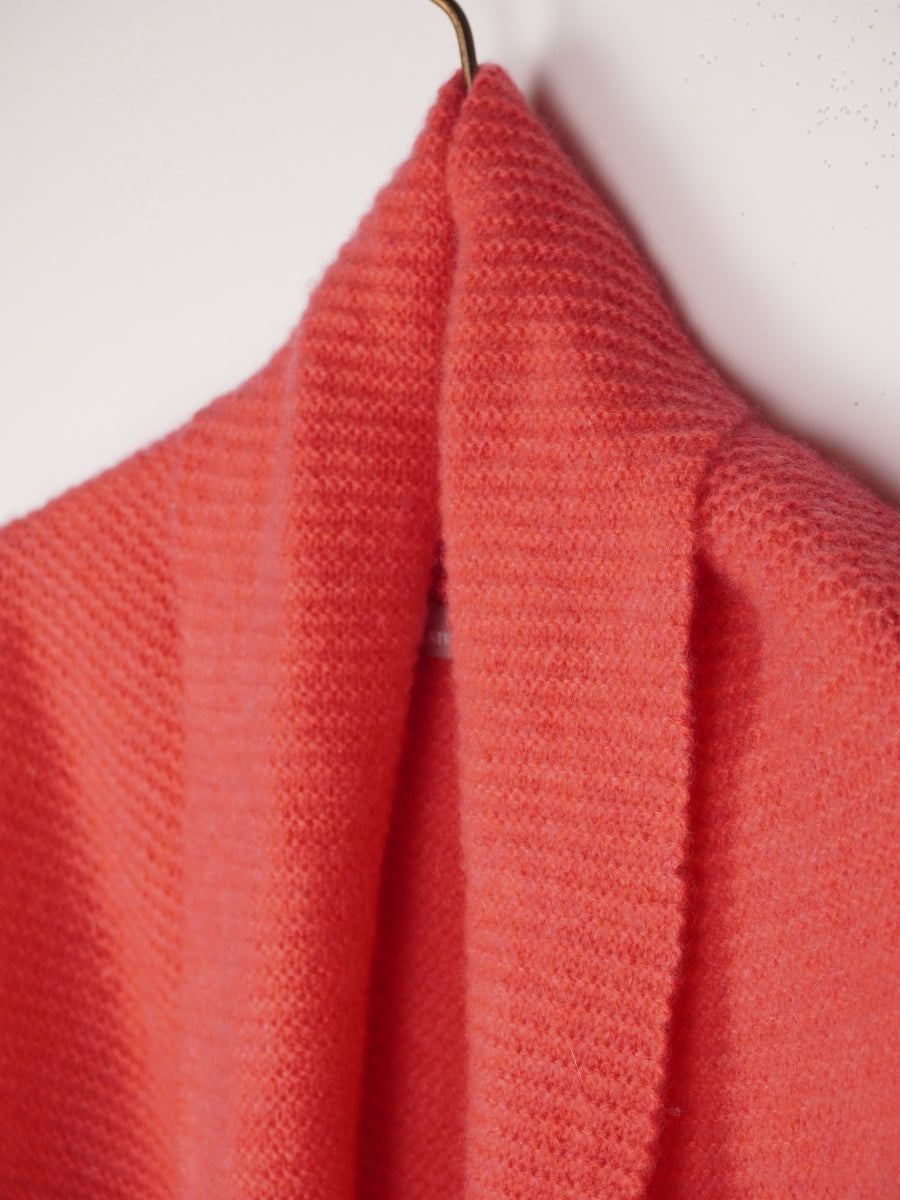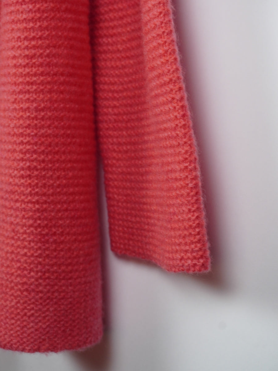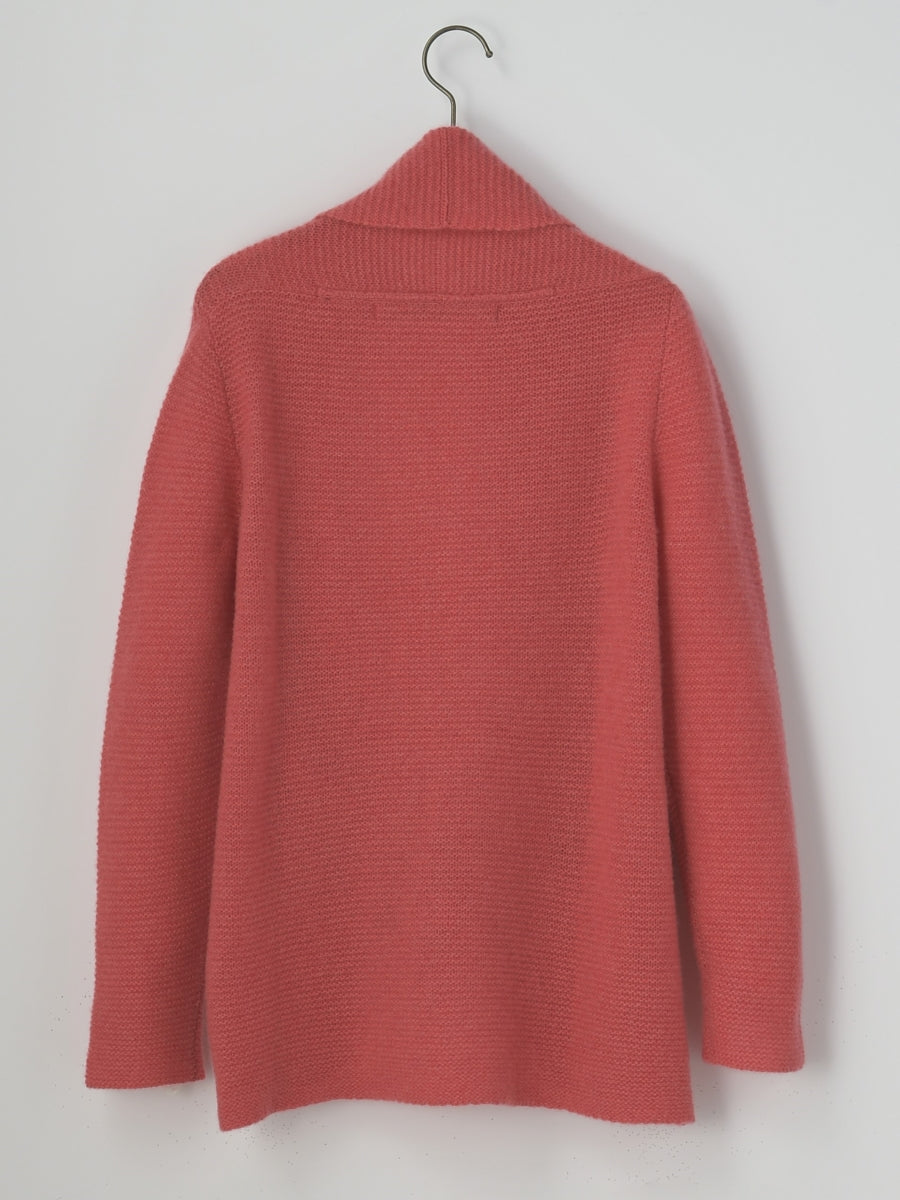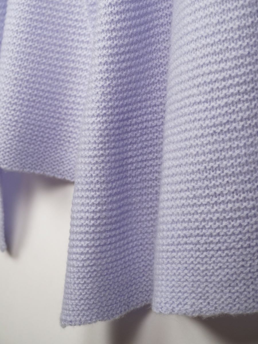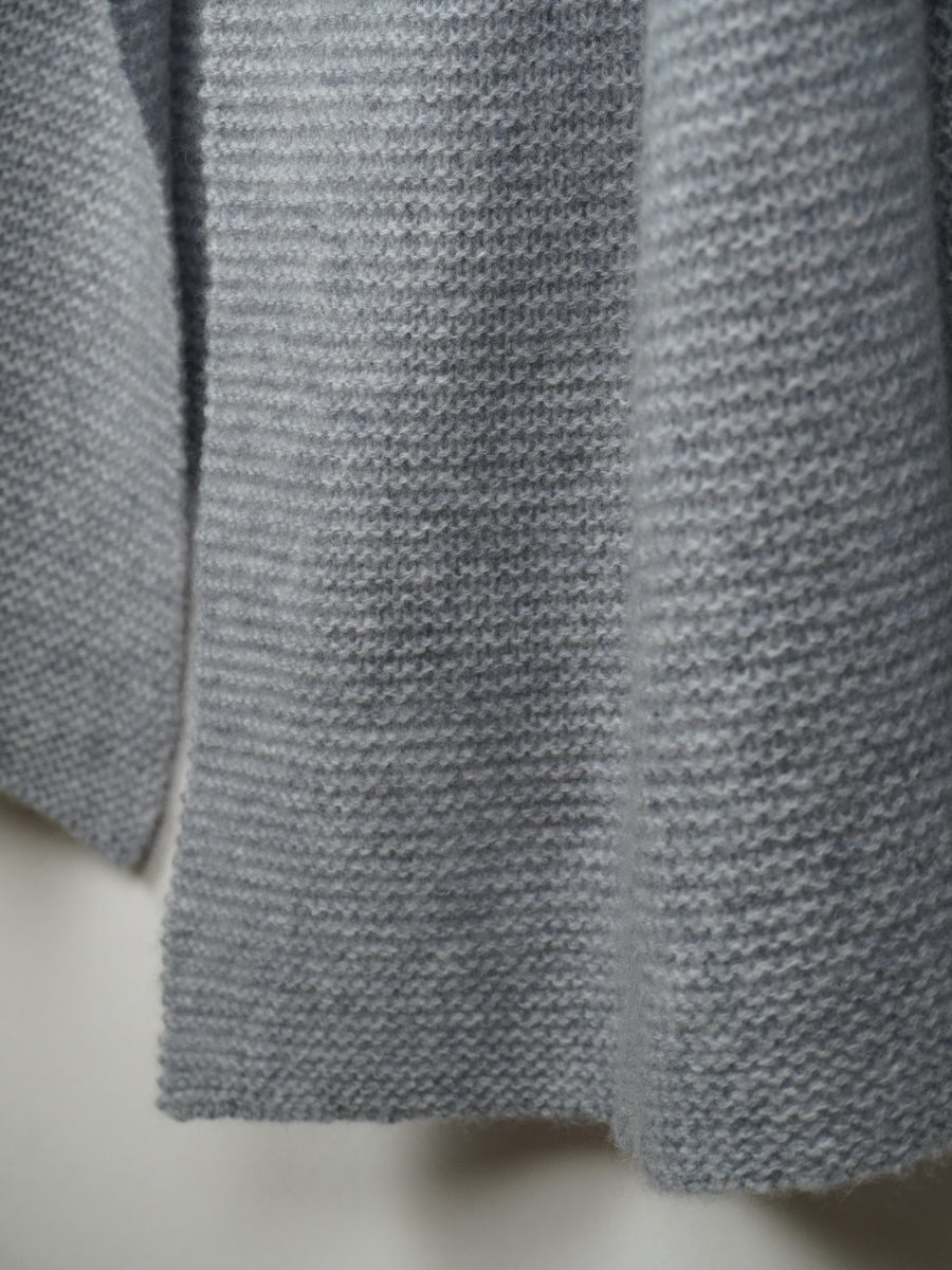 注目のガーター編みカーディガンが今年も色目を変えて登場です。小さなショールカラーが特徴で、首元をスッキリ見せるデザインです。