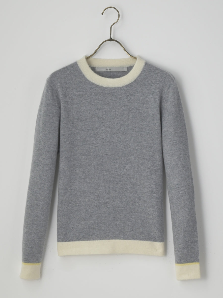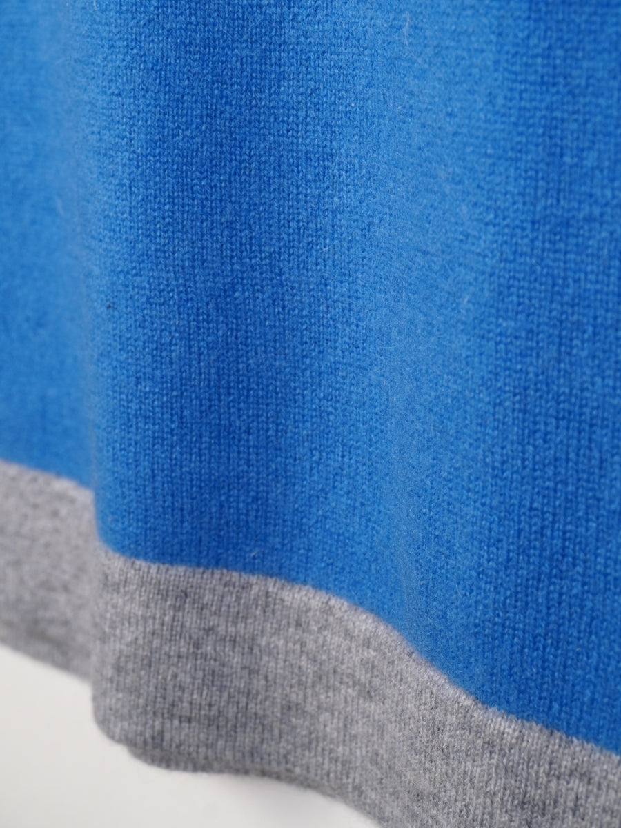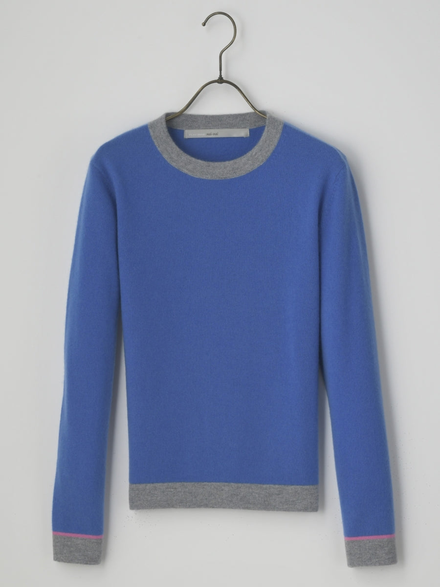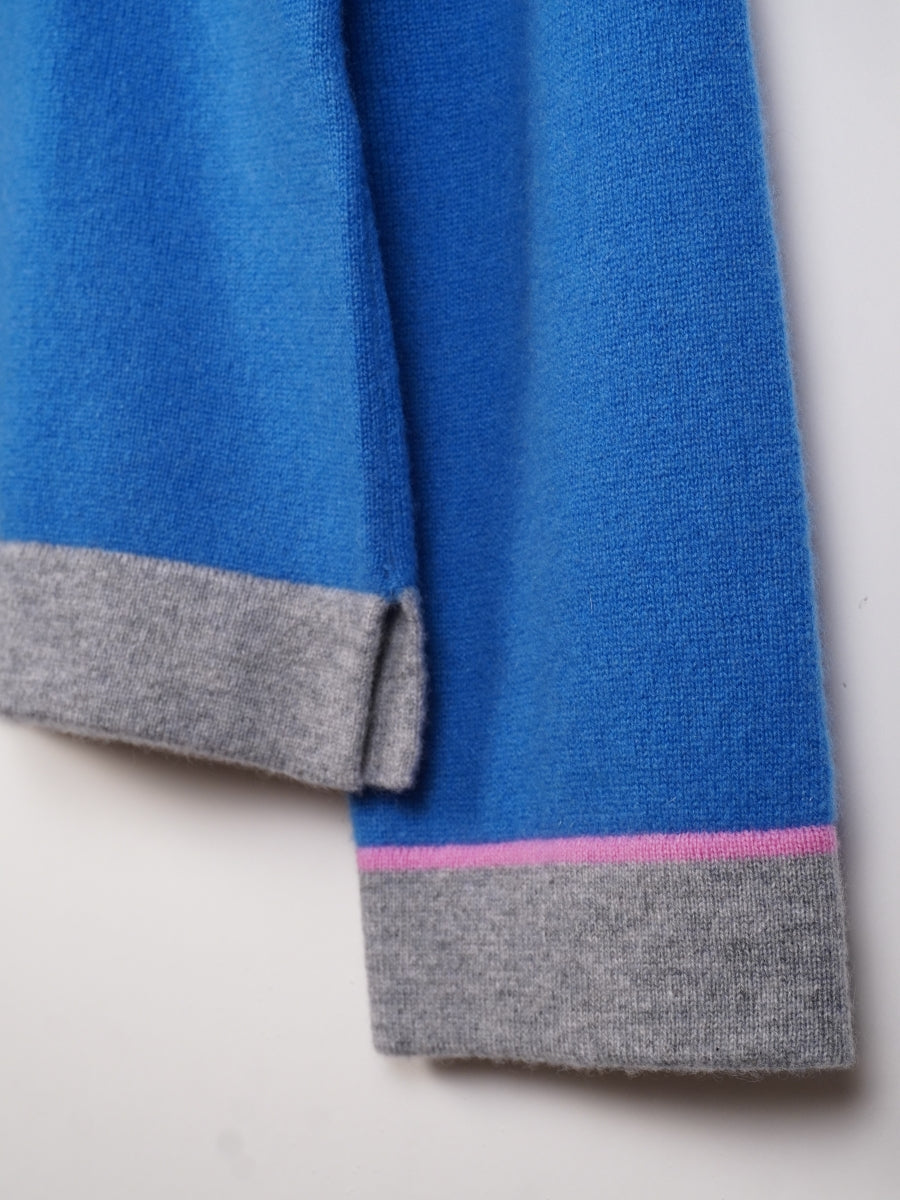 シンプルなプルオーバーの袖口をカラーリングでポイントをつけました。ブルーベースには、グレーとピンクでグレーベースにはオフホワイトとイエローでインパクトをつけたセーターです。