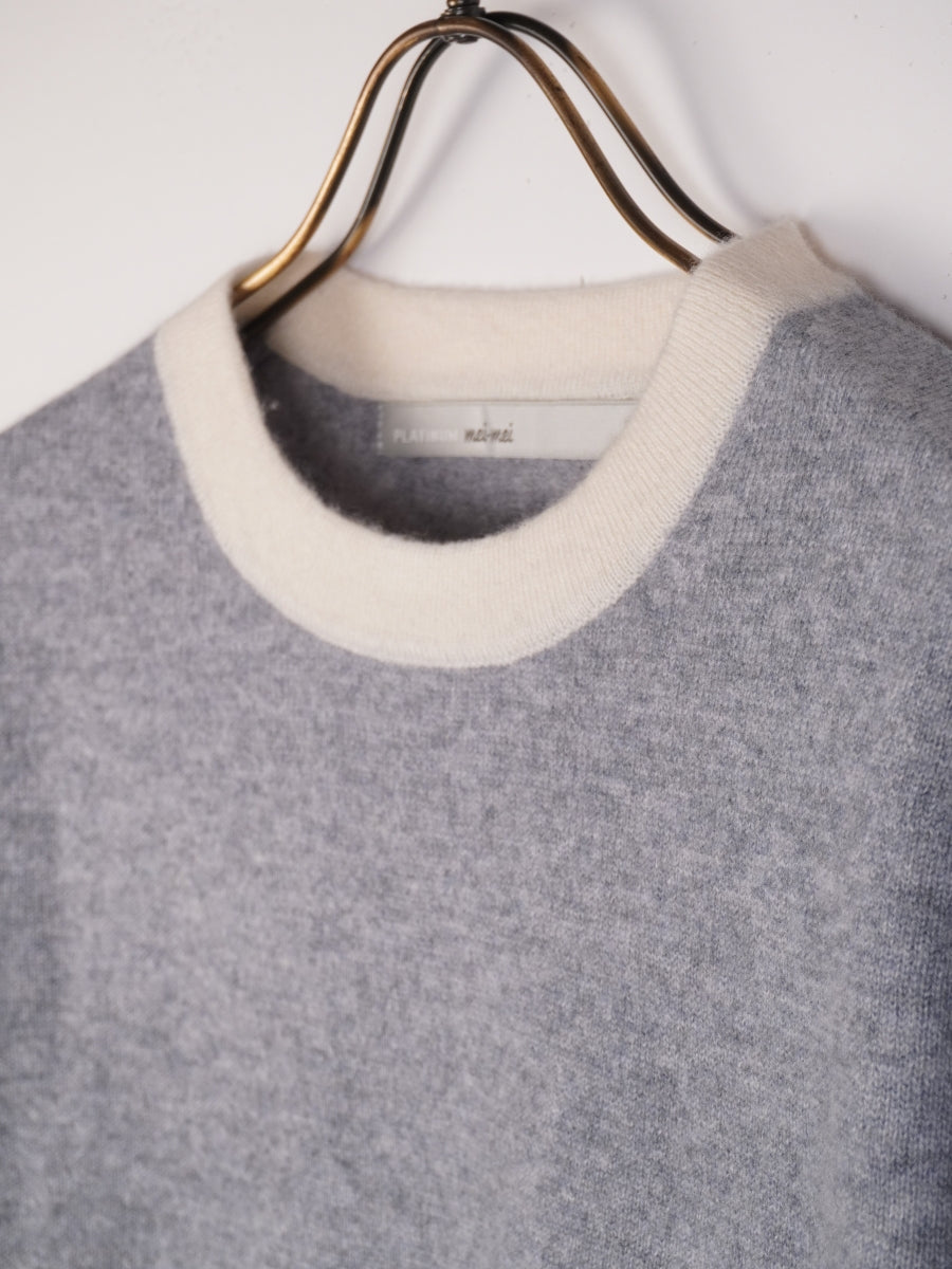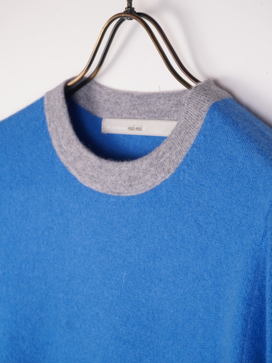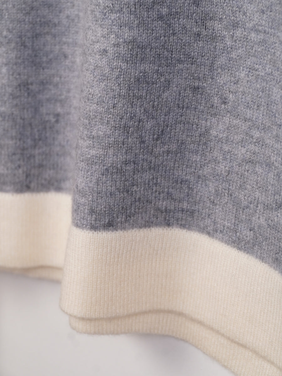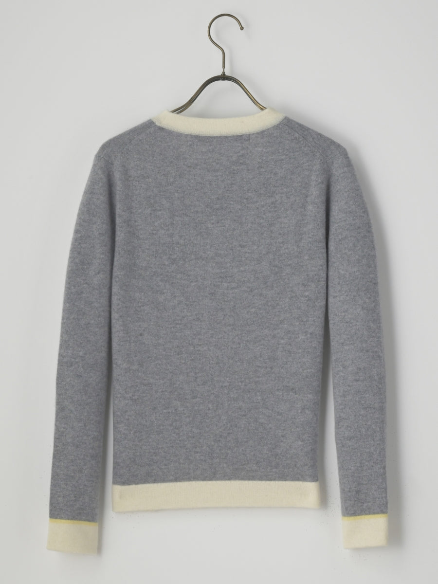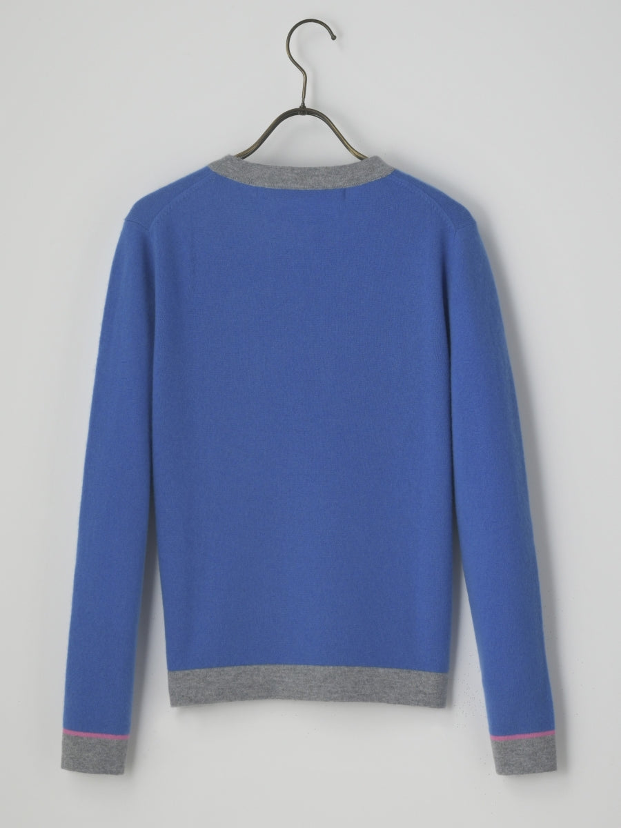 シンプルなプルオーバーの袖口をカラーリングでポイントをつけました。ブルーベースには、グレーとピンクでグレーベースにはオフホワイトとイエローでインパクトをつけたセーターです。