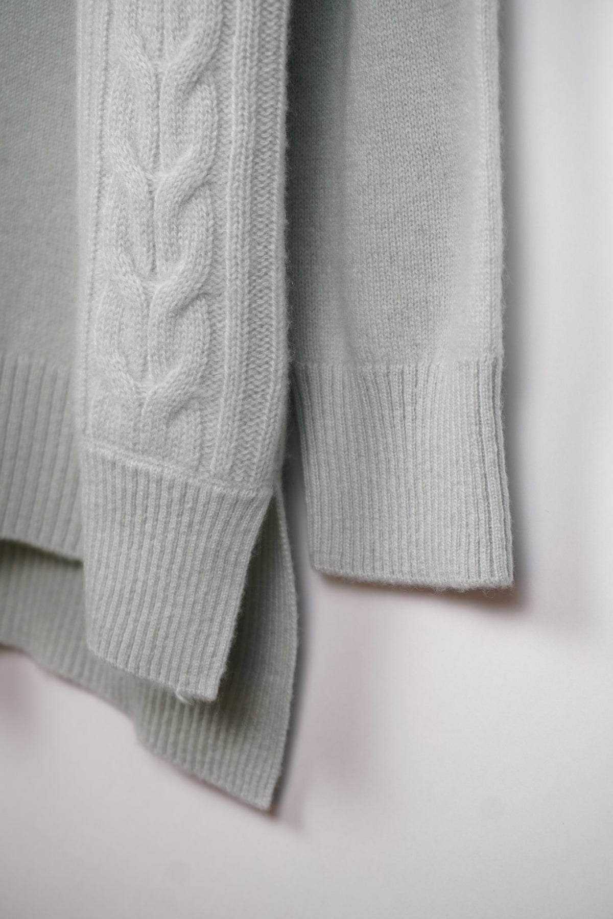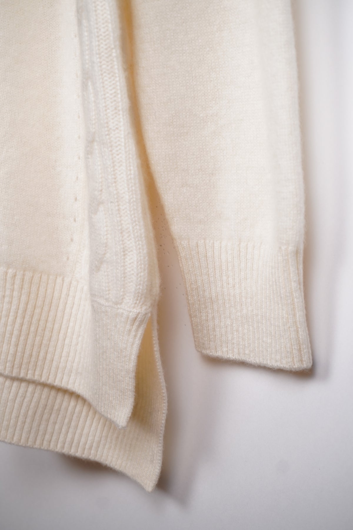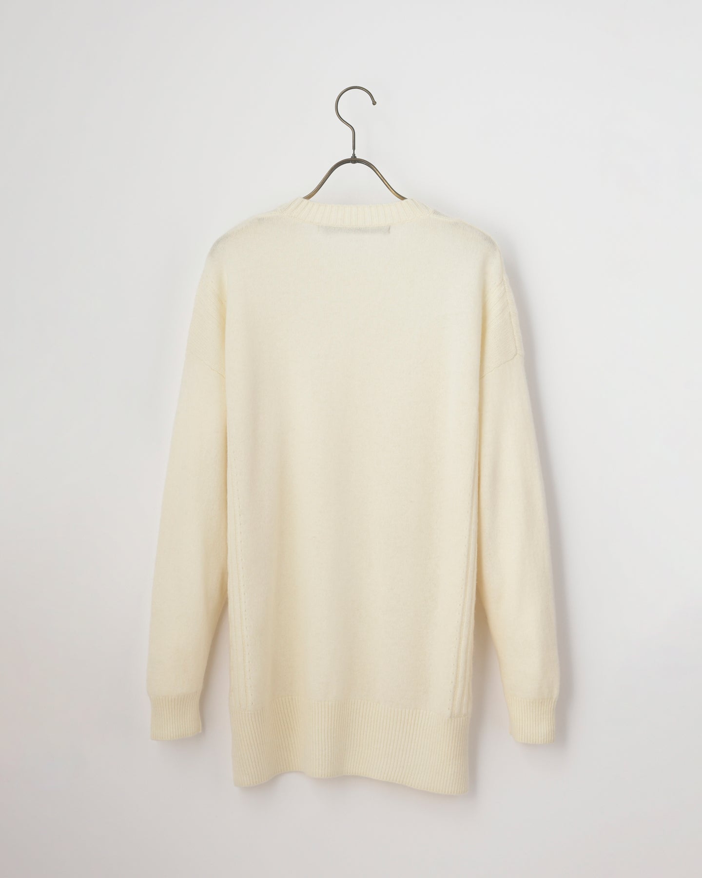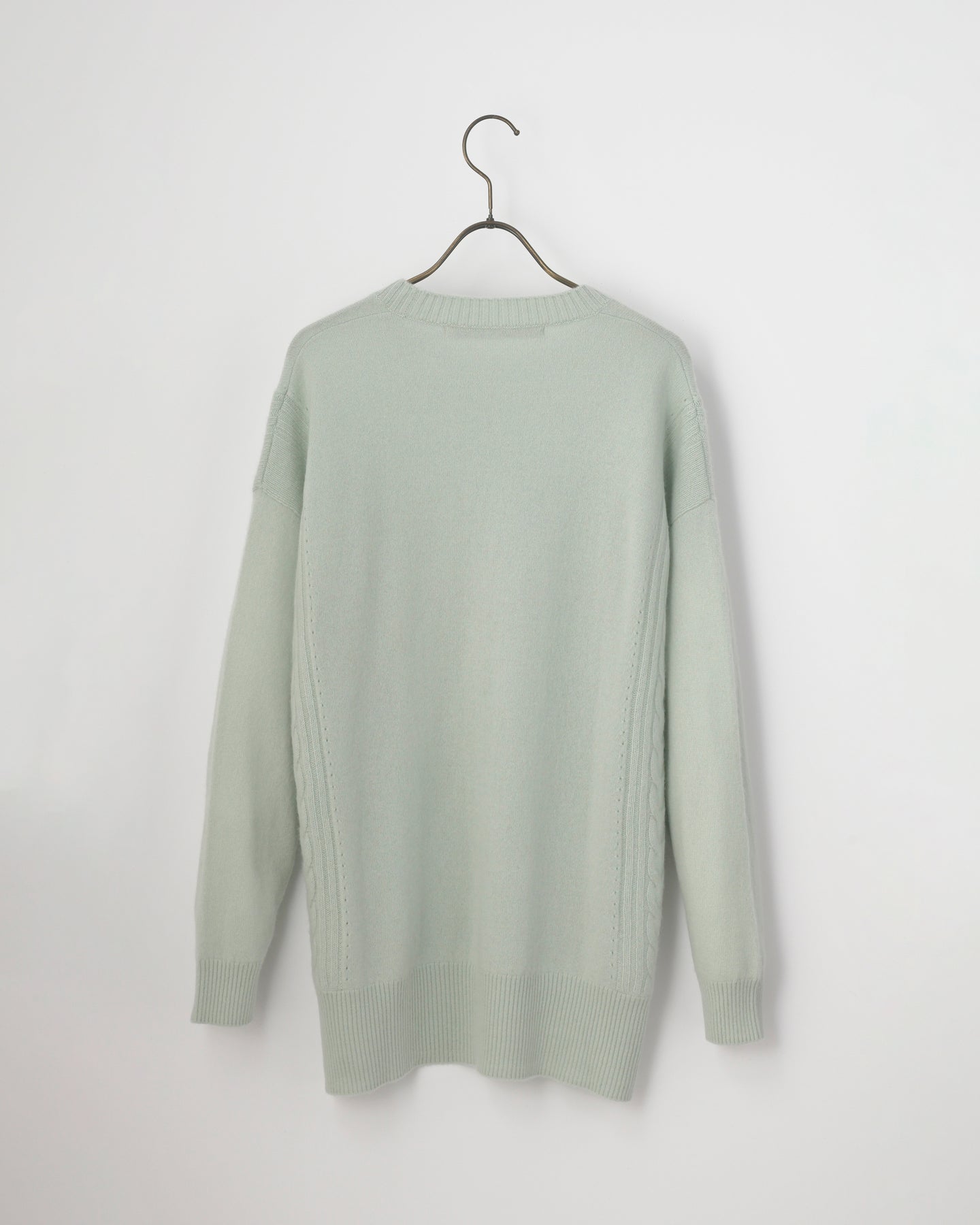 腰のあたりまで包み込むようなチュニックセーターです。両脇のスリットも特徴で動きやすくなった仕様。軽やかに揺れる裾まわりとサイドのケーブル編みを味わってください。