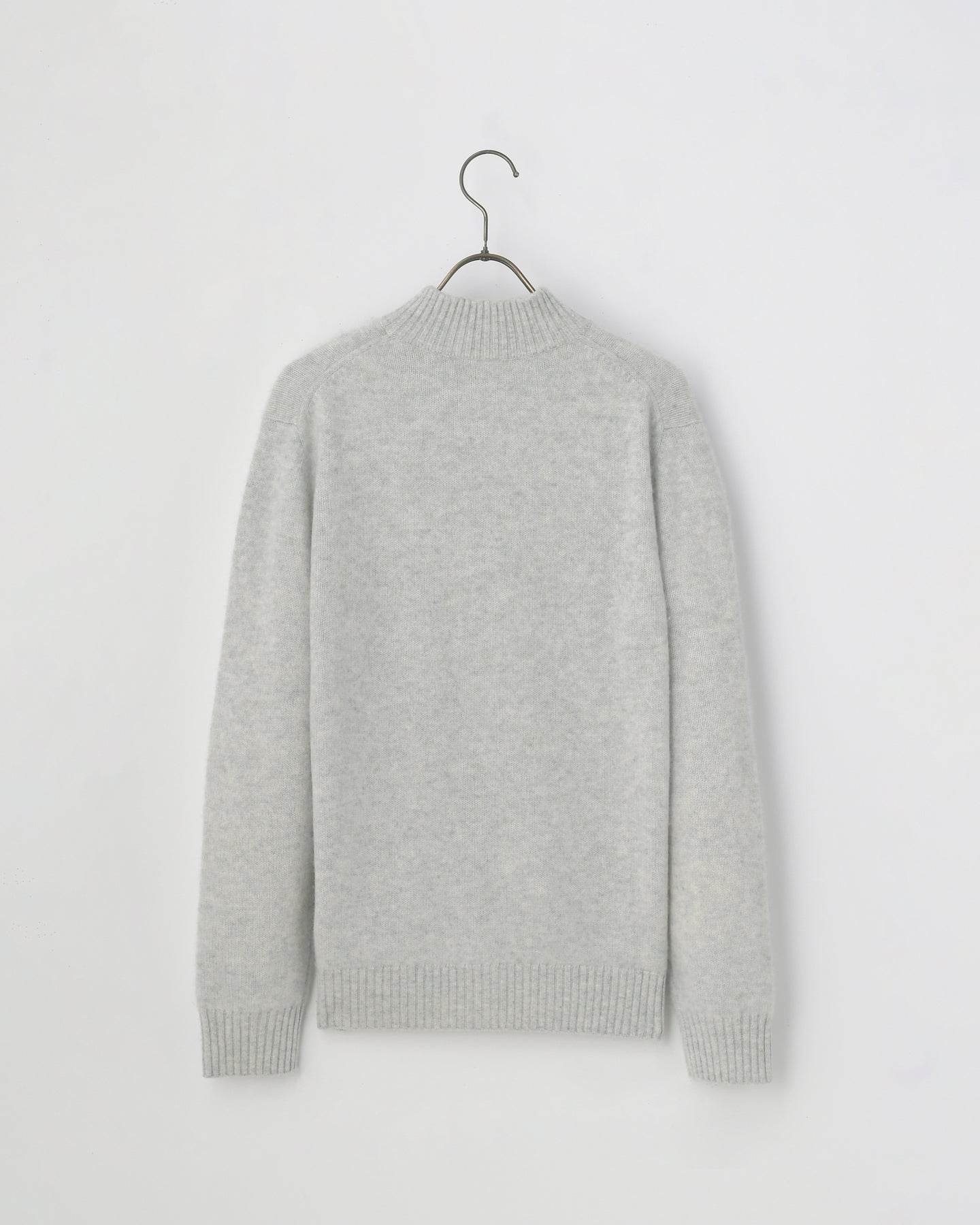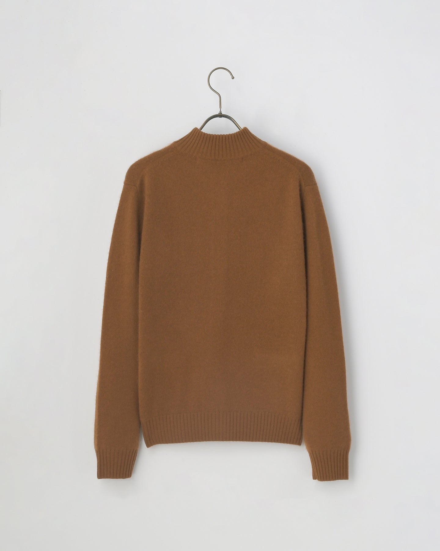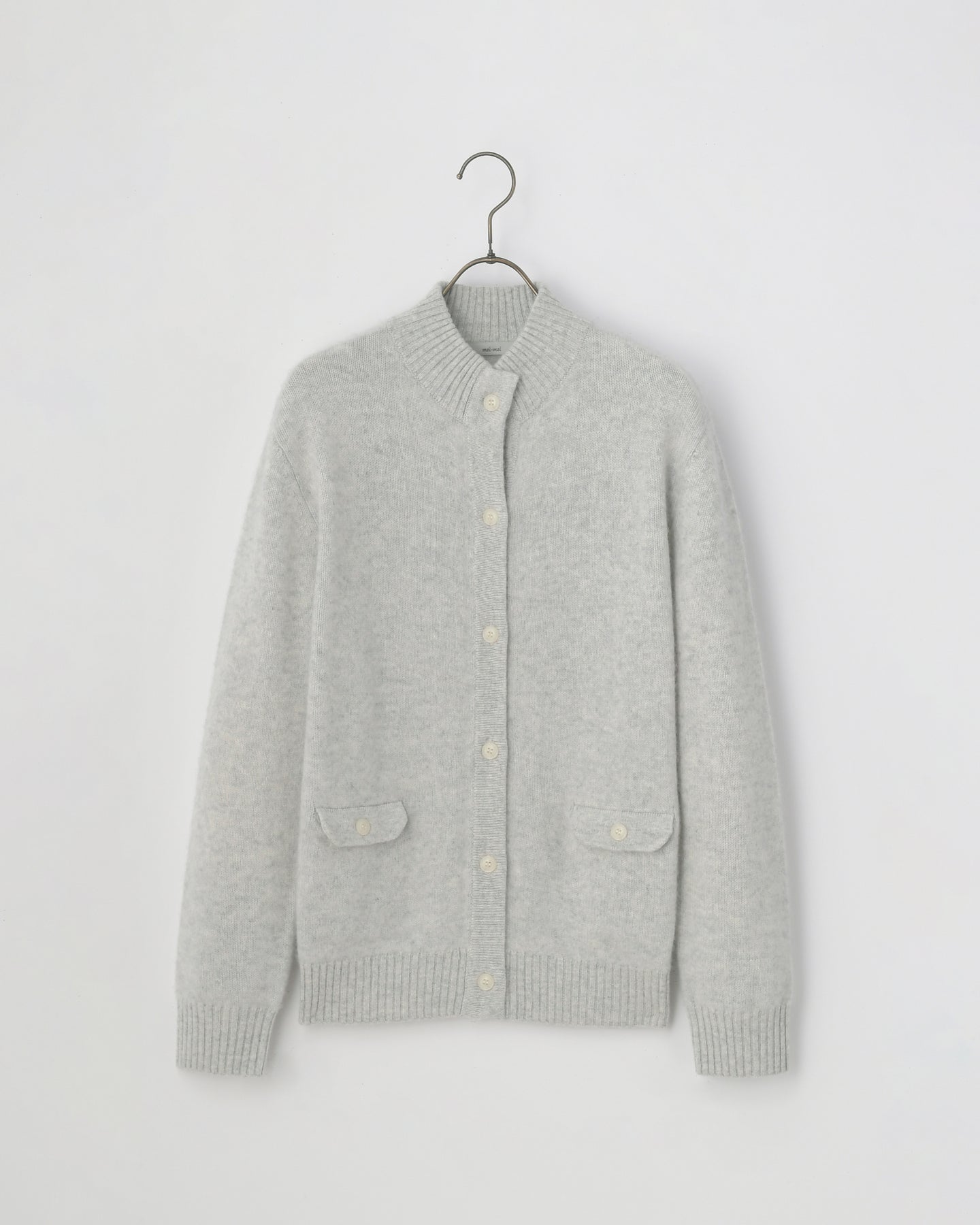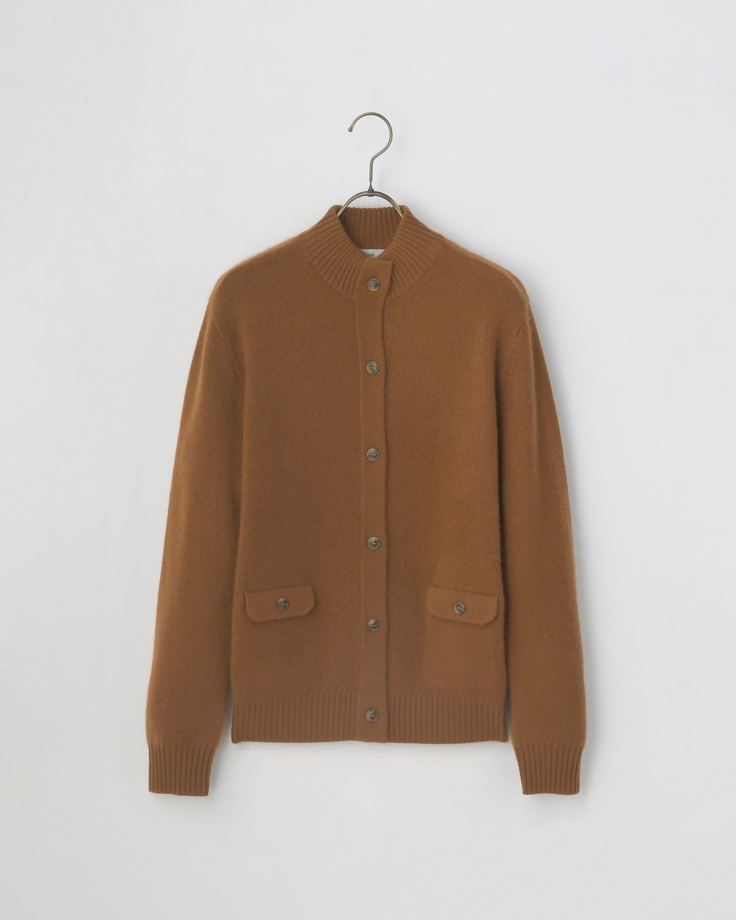 カシミヤ編地に特殊な加工(縮絨)を施したハイネックタイプのカーディガン。前立てのボタンとポケットがアクセントになっています。