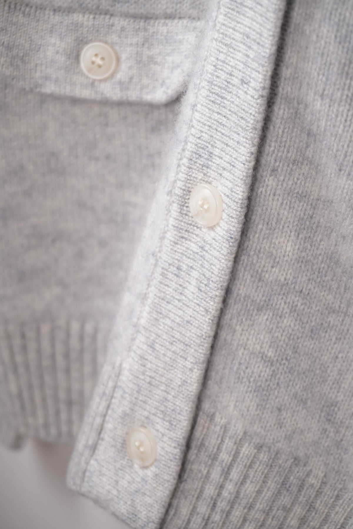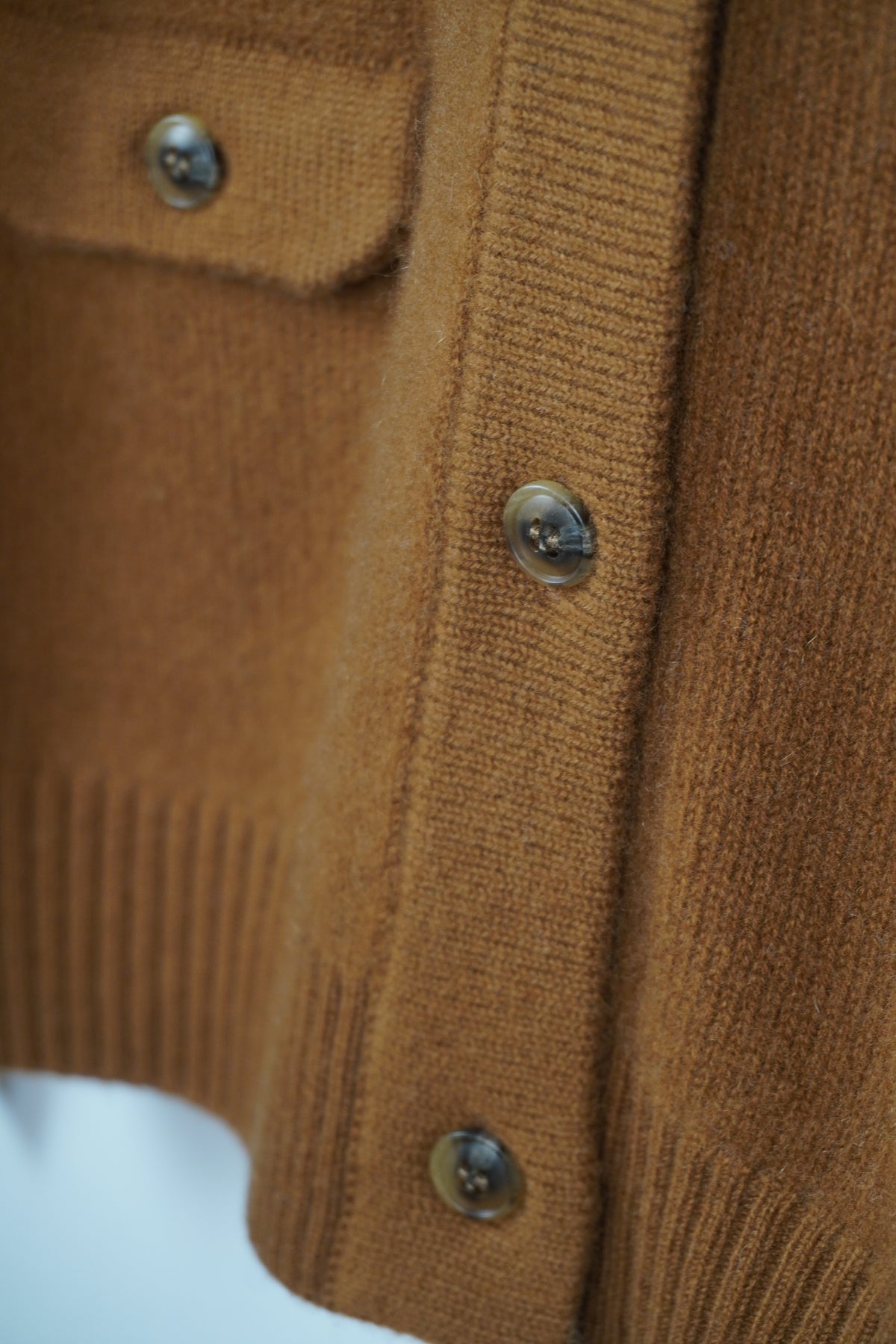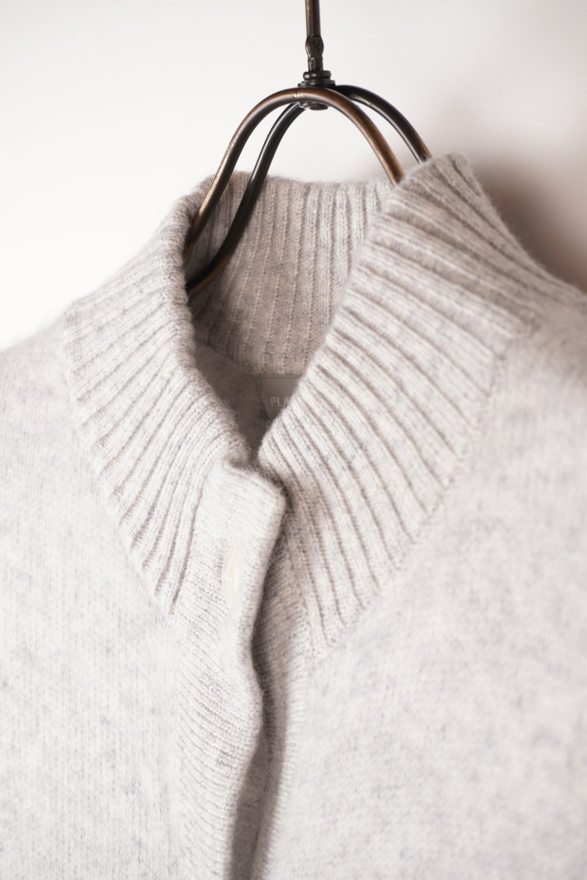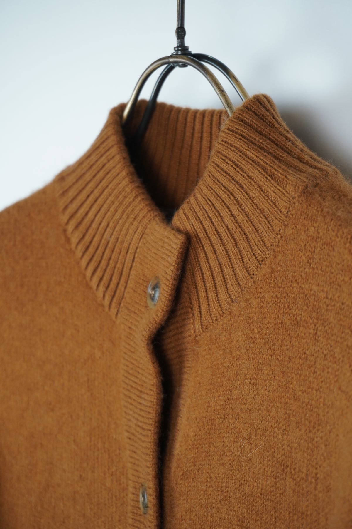 カシミヤ編地に特殊な加工(縮絨)を施したハイネックタイプのカーディガン。前立てのボタンとポケットがアクセントになっています。