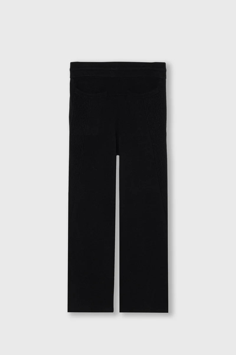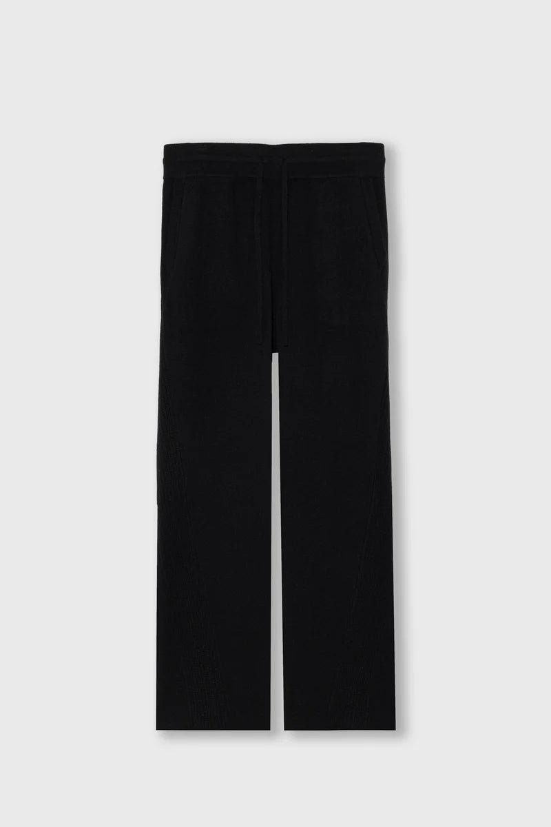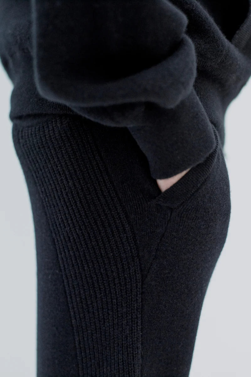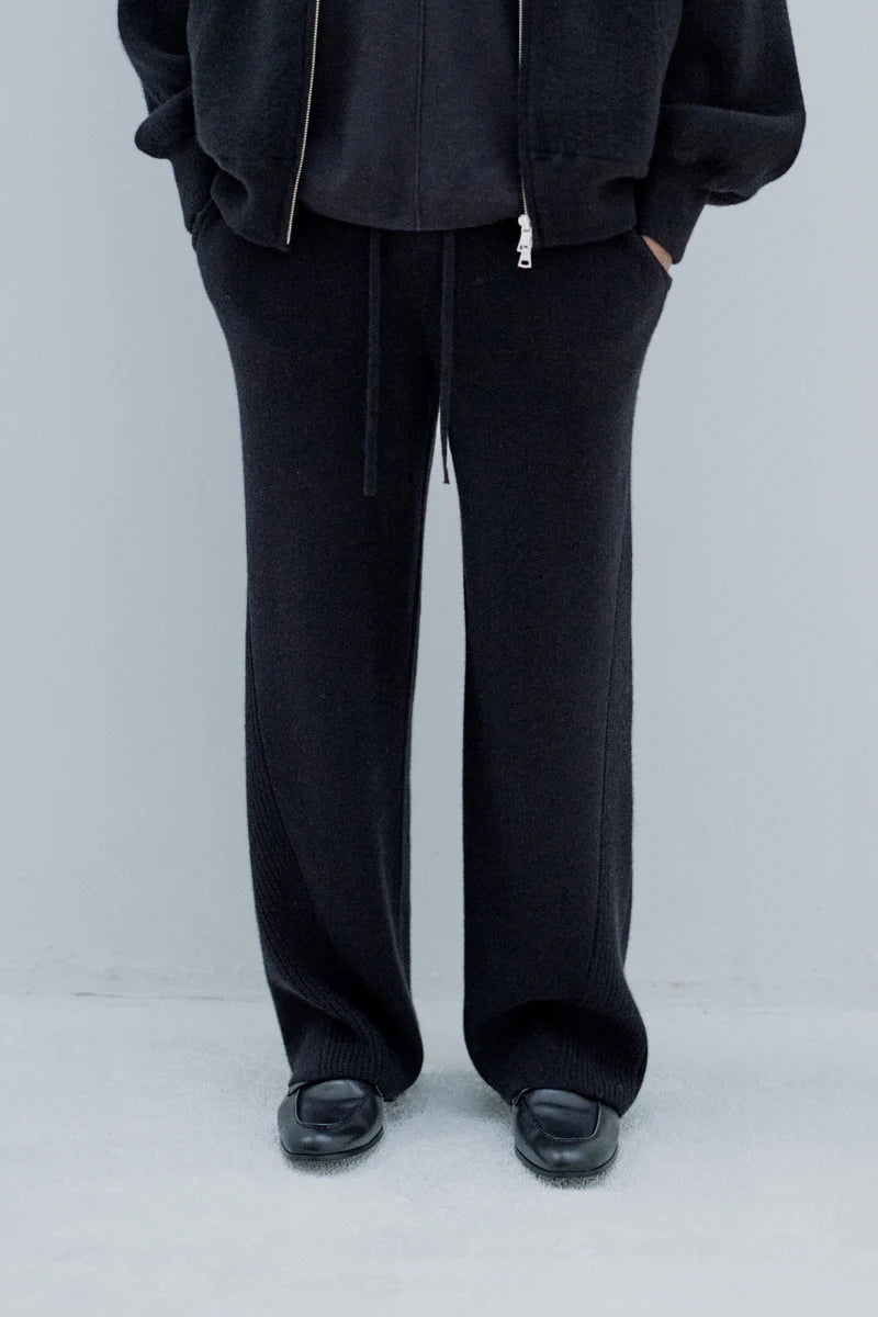 100%ホワイトカシミアを使用した贅沢なスウェットパンツ。最高の肌触りを脚全体で感じられます。脇の畦編みのラインが、後ポケットから前見頃にかけて斜めに入っているのが特徴的なデザインです。スウェットパンツの仕様ながらも、後ポケットは片玉縁ポケットになっていたりと、綺麗目で大人な印象を持ったスウェットパンツになっております。