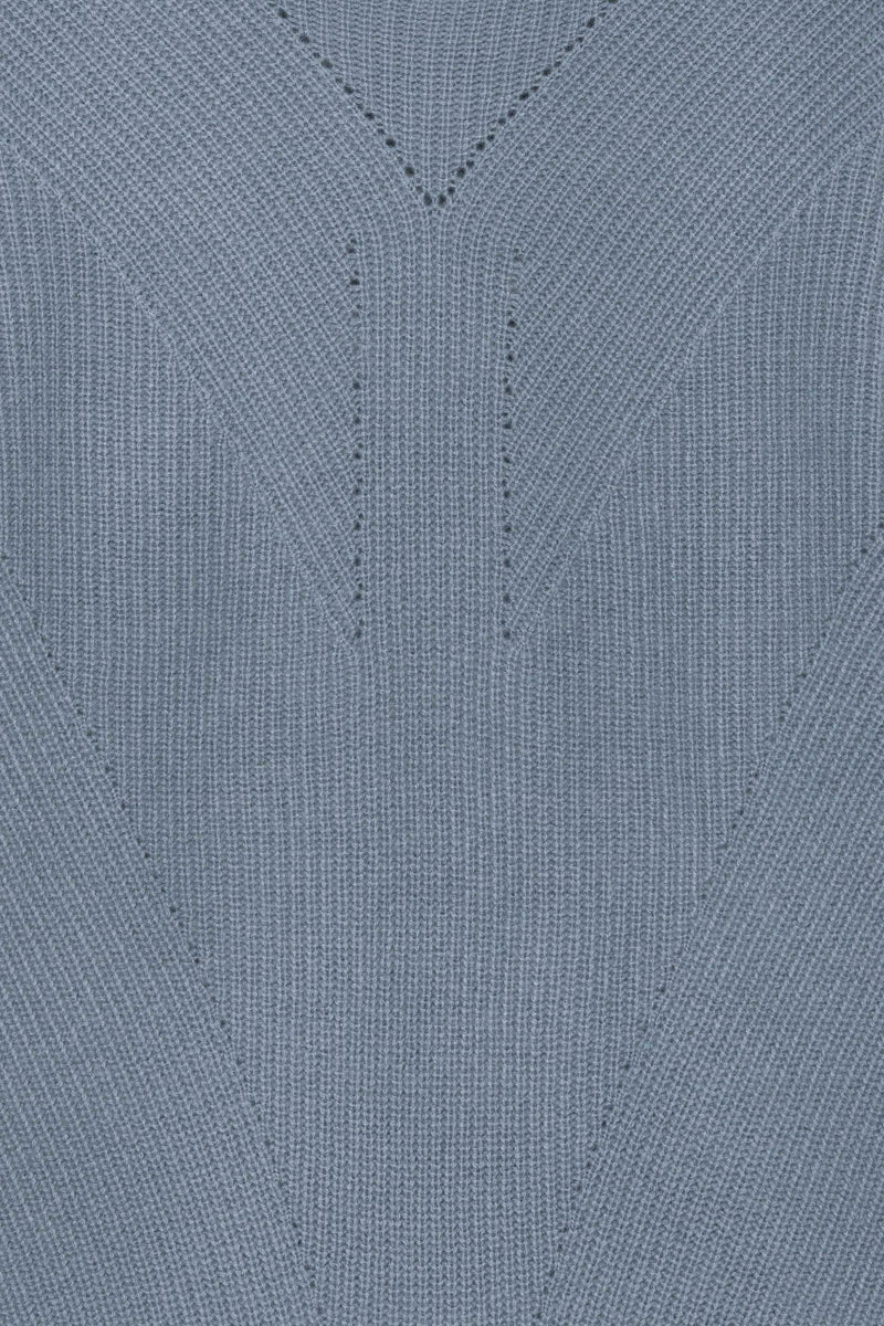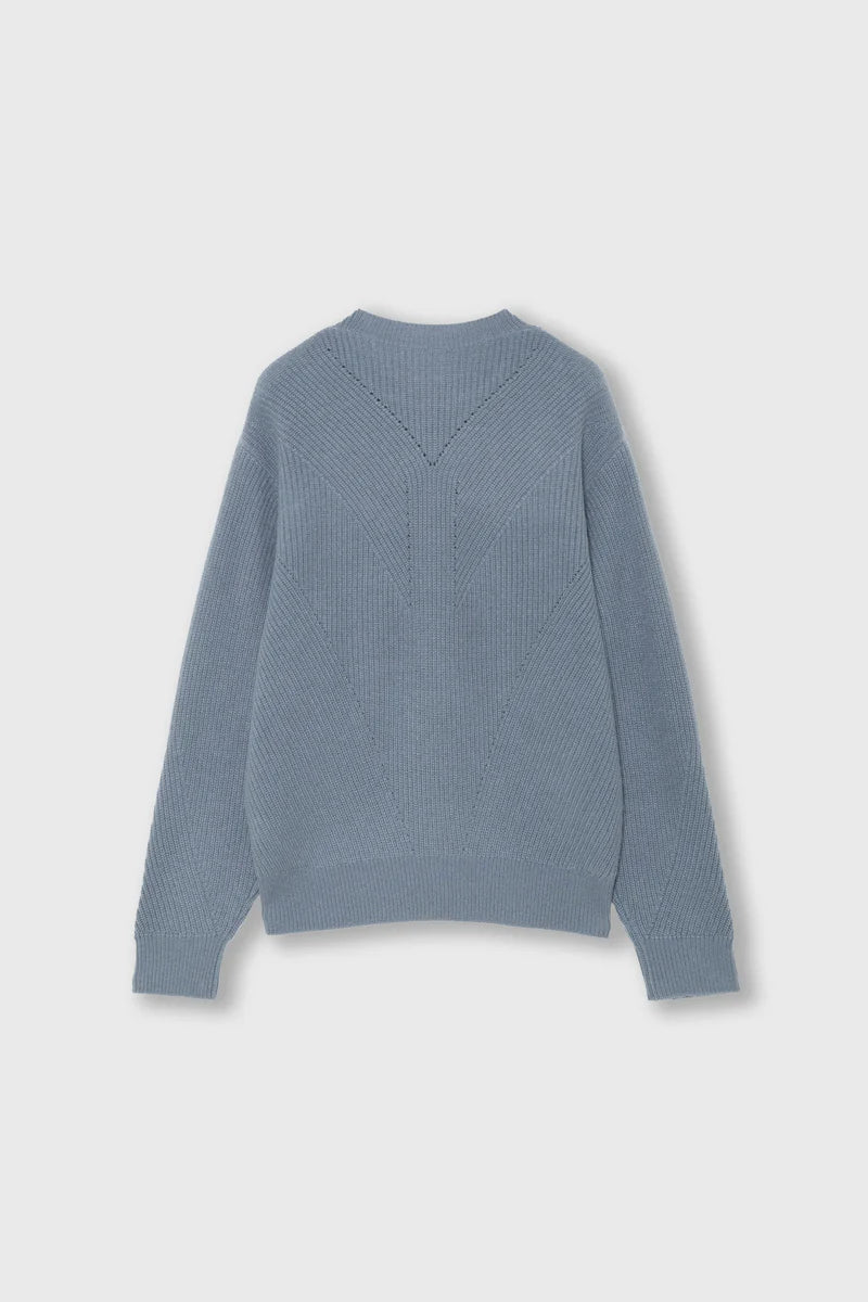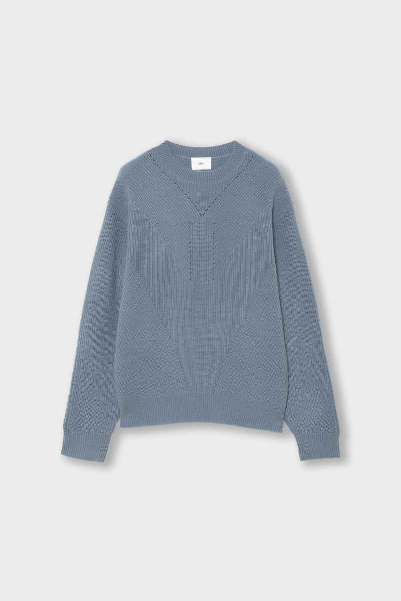 100%ホワイトカシミアを贅沢に使用した畦編みのプルオーバー。畦編みの流れを生かしたデザインで、斜めに逃げていく編み地はシャープな印象のラインを描いています。派手さはないですが、印象的な編み地の陰影が、落ち着いた中にも適度な主張を持ったデザインになっています。厚さも、上にアウターを着用しても気にならない適度な厚みで、非常に使いやすいアイテムです。
